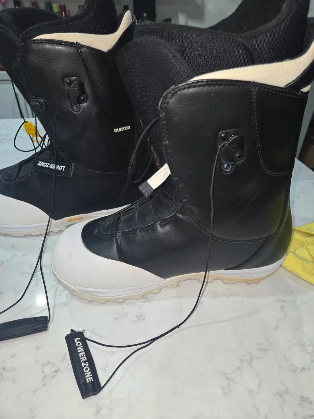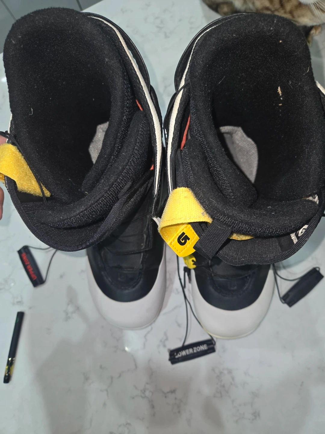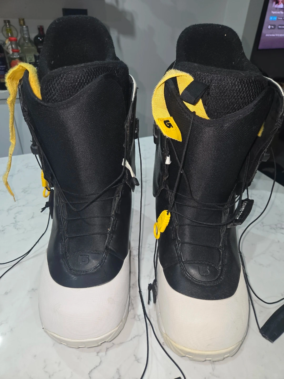 Selling a pair of 2008 Burton serow snowboard boots. Size 12. They're in good condition and ready for the slopes! These boots feature a black and white design with a yellow accent on the tongue. They also have the Vibram sole for great traction. Used twice. Not a tear or a scratch