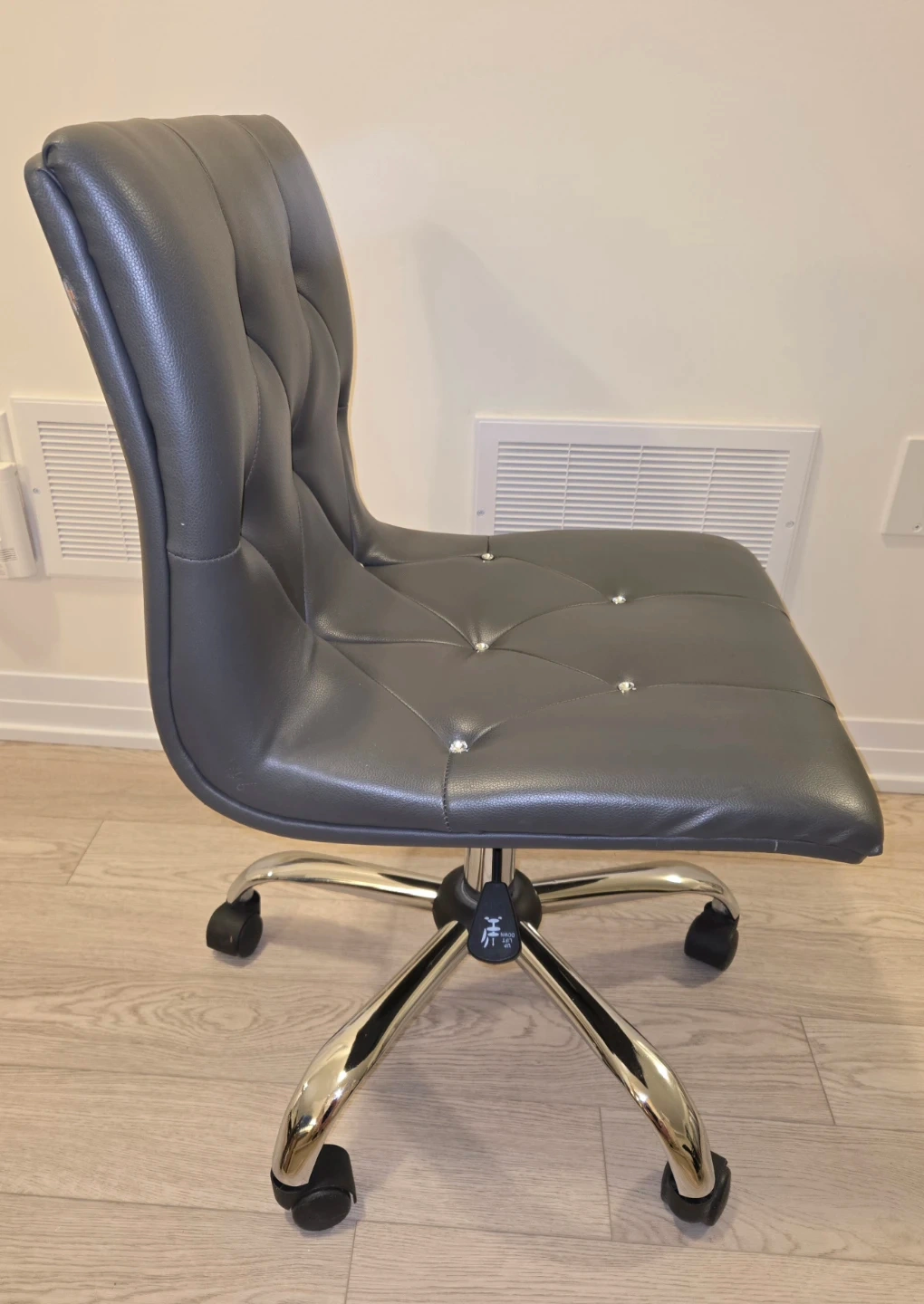Selling a stylish grey office chair! It features a comfortable, tufted seat and a shiny chrome base with smooth-rolling casters. This chair would be a great addition to any home office or workspace