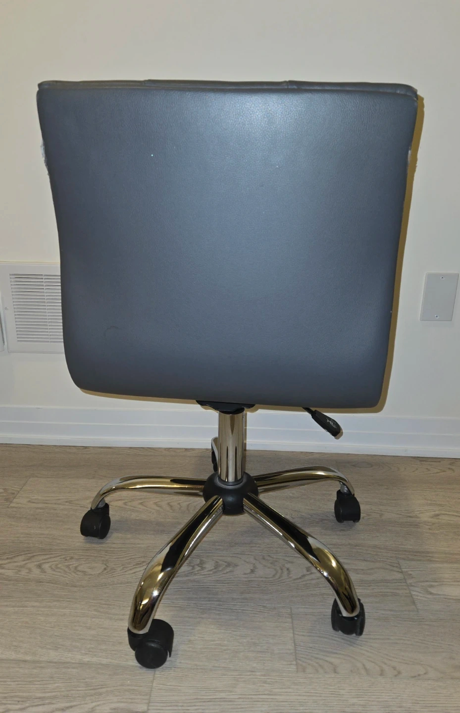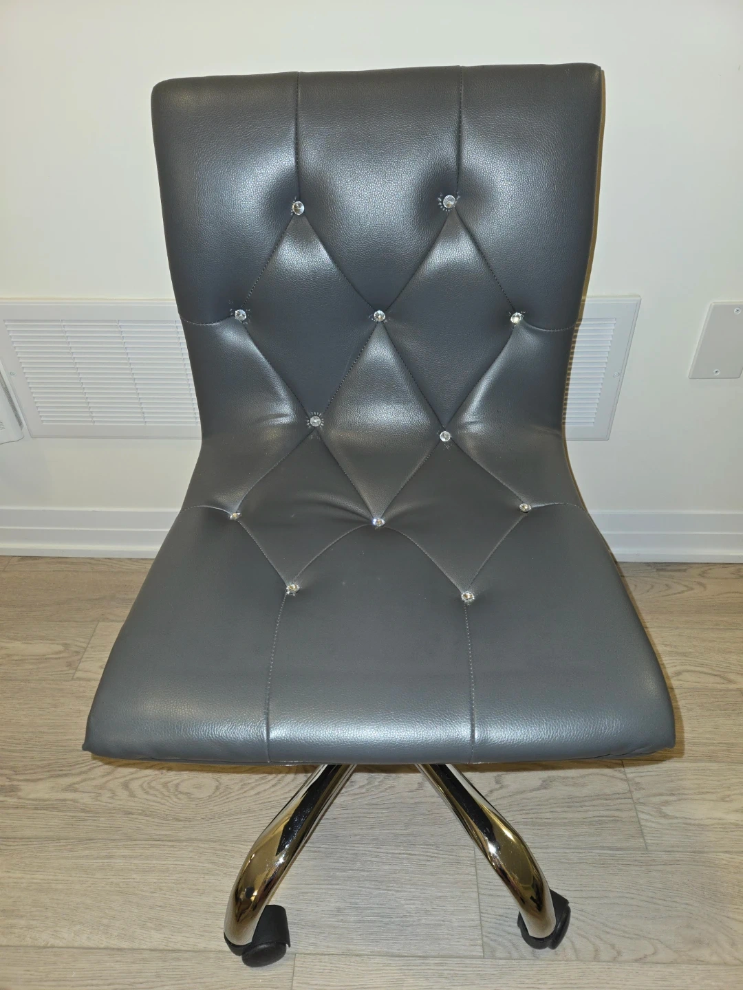Selling a stylish grey office chair! It features a comfortable, tufted seat and a shiny chrome base with smooth-rolling casters. This chair would be a great addition to any home office or workspace