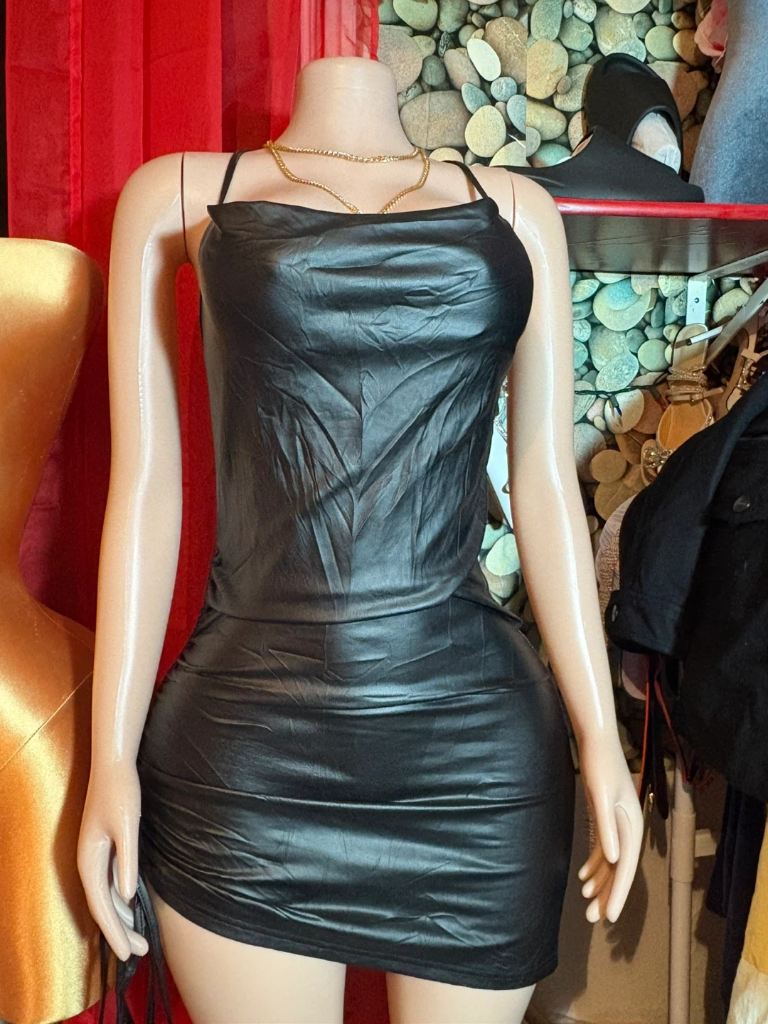 Here's a cute black mini dress! It appears to be made of a faux leather material. Perfect for a night out or a special occasion