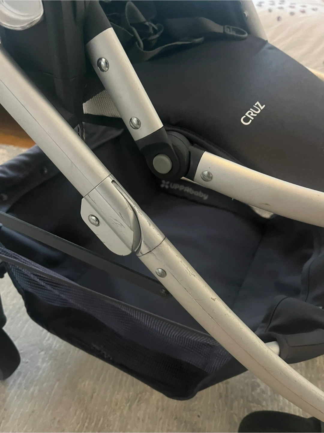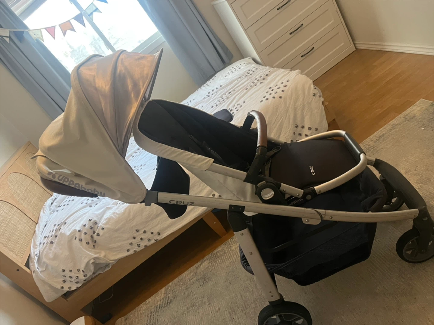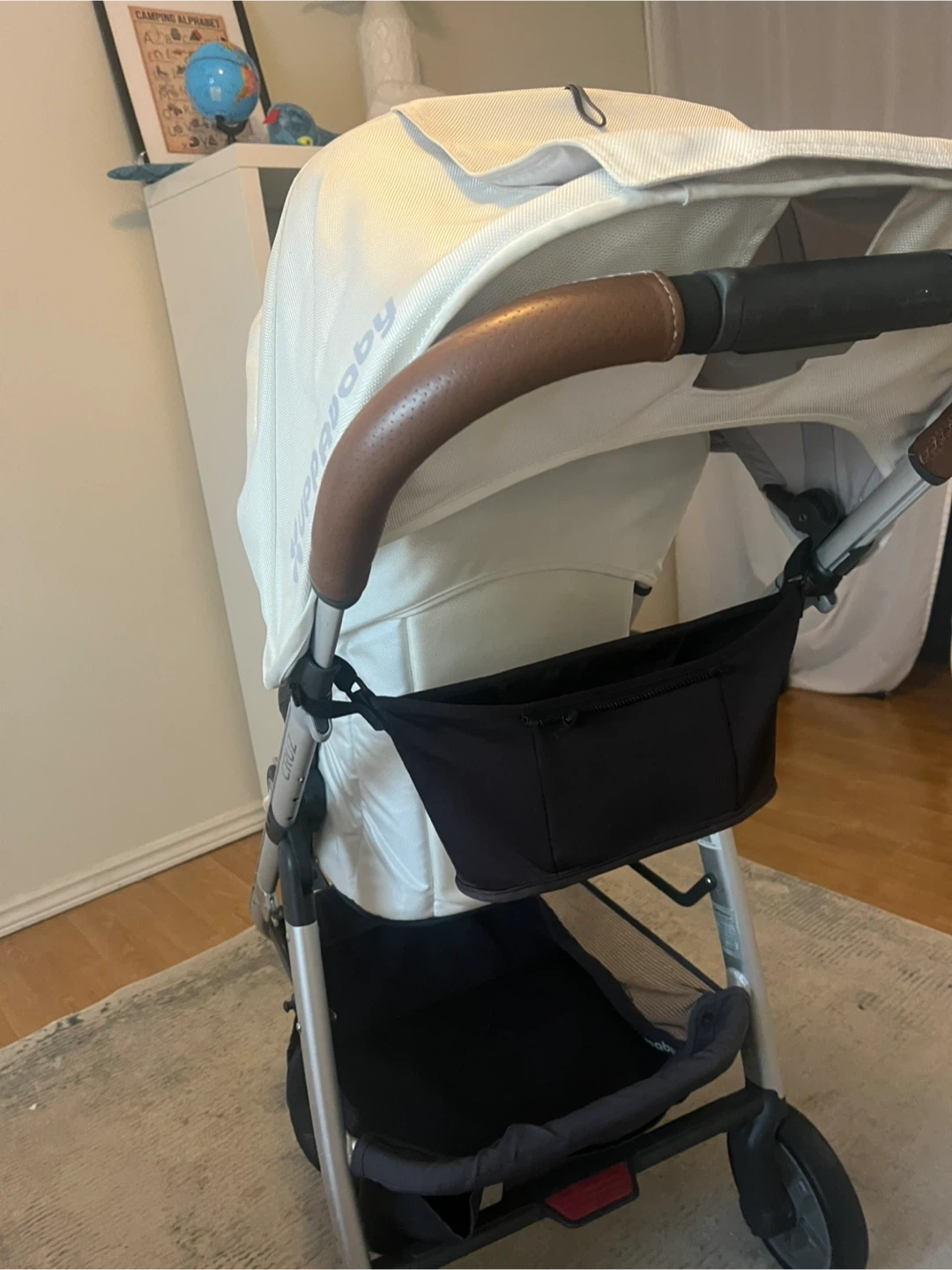 Selling a gently used UPPAbaby Cruz stroller. It's in great condition and ready for a new family. The stroller features a brown leather handle and a spacious storage basket. Perfect for navigating city streets or park trails!