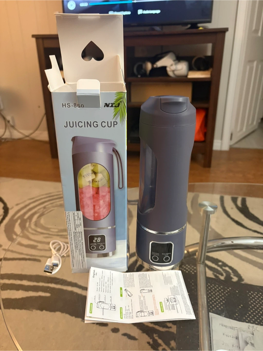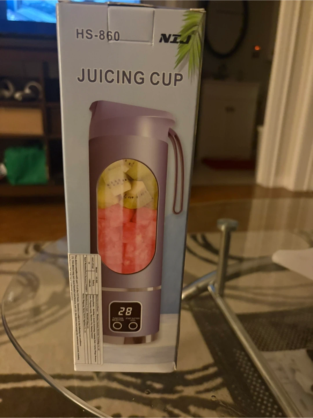 I'm selling a NJI HS-860 Juicing Cup in purple! It comes with the box, charger, and instructions. It measures approximately 10 inches tall and 3 inches in diameter.