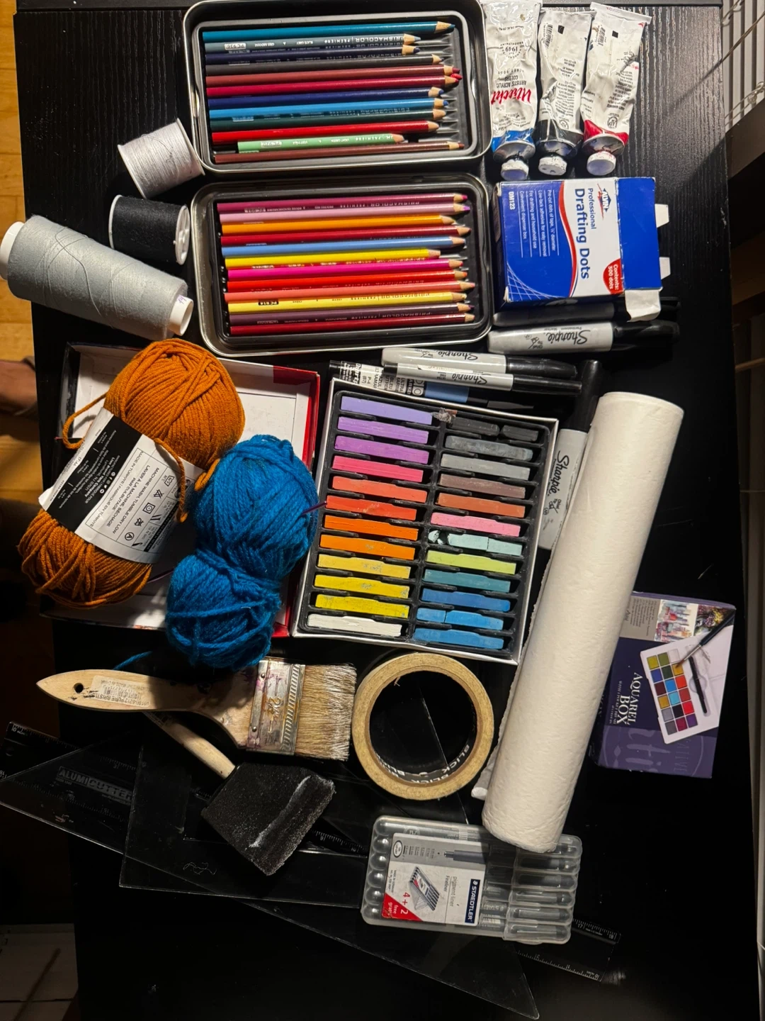Selling a mixed lot of art supplies! Includes Prismacolor colored pencils, Utrecht artist acrylic paints, Sharpie markers, drafting dots, watercolor box, Staedtler pigment liners, Alvin cutter, yarn, brushes, and more. Perfect for artists and crafters of all levels. I have a lot more like big paper pads for sketching and drafting. Reach out for more info