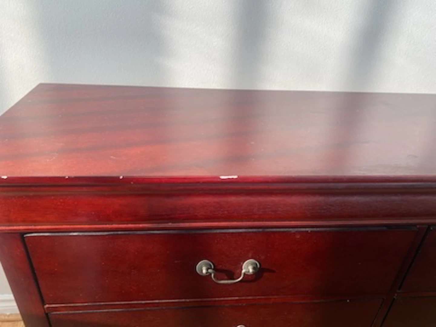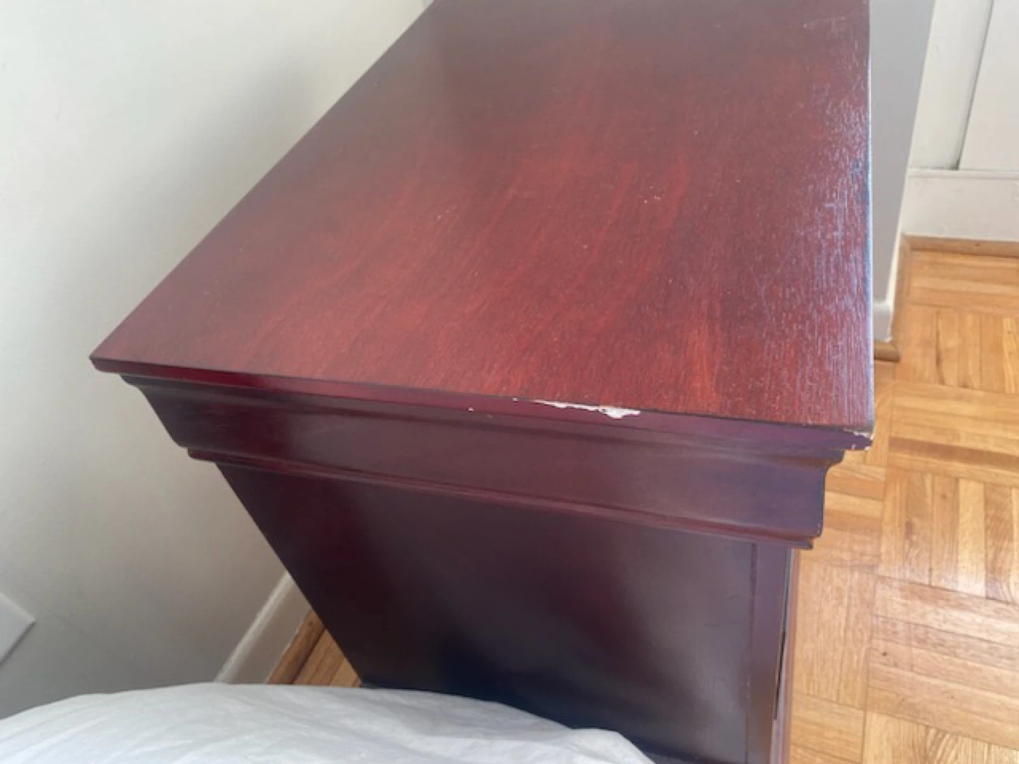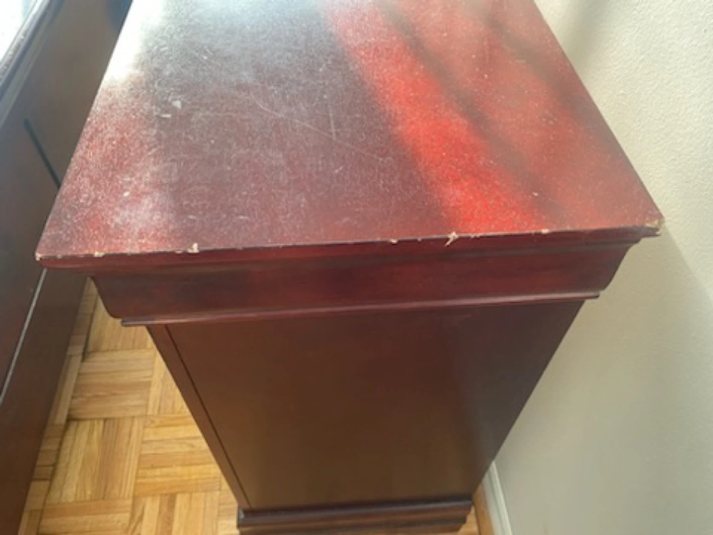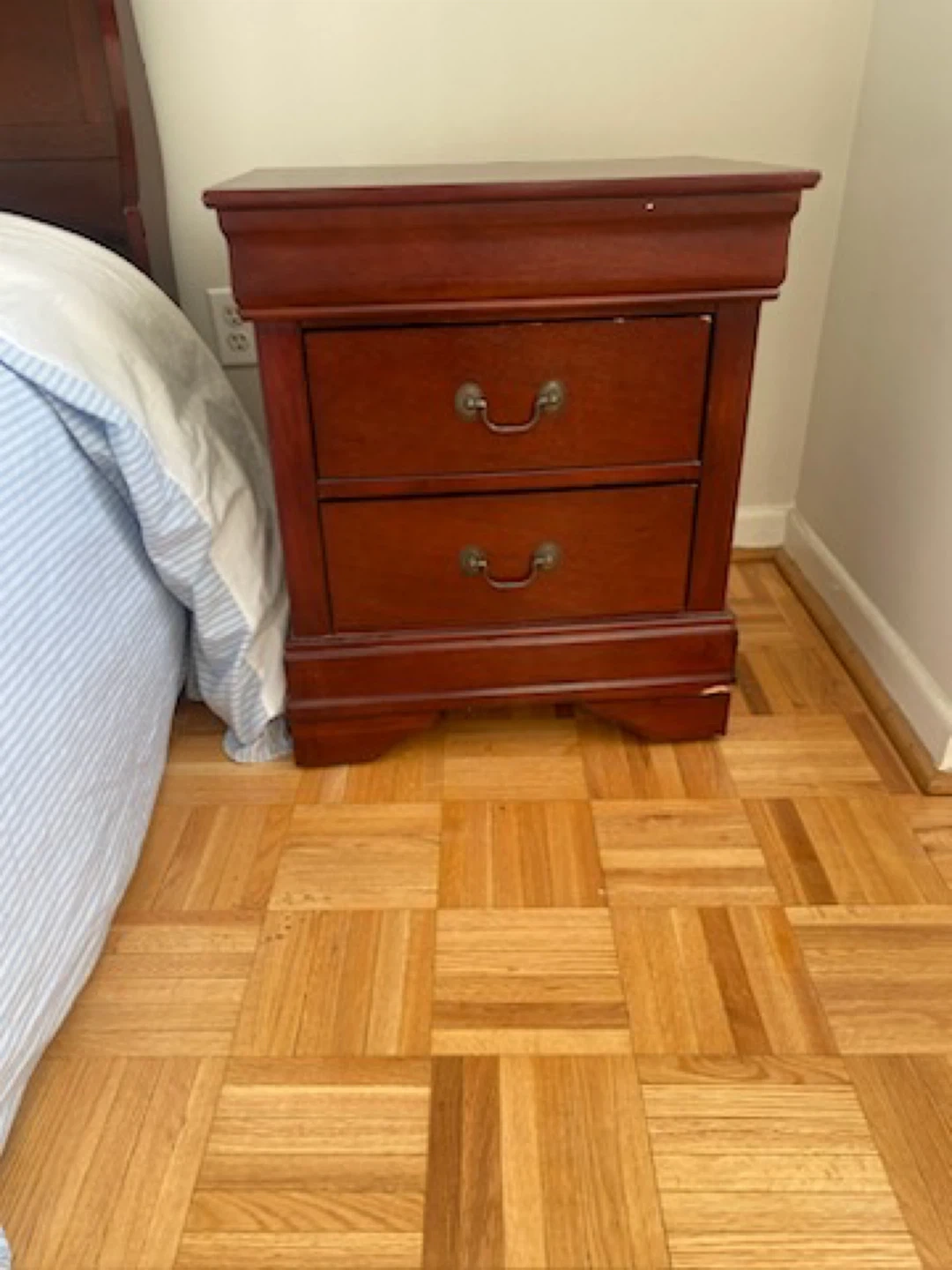 Moving at the end of the month! Must go! Selling a bedroom set that includes a Double bed frame and two matching nightstands. The set is a dark wood colour and has some wear and tear, as shown in the pictures. The nightstands have two drawers each.