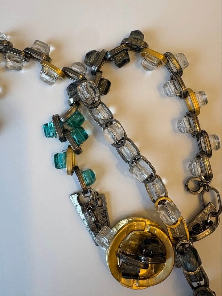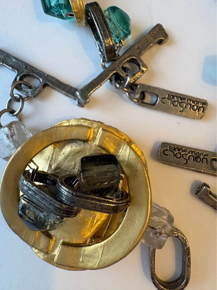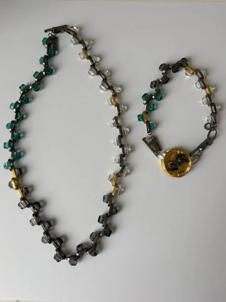 Elevate your collection with this handcrafted jewelry set from celebrated Montreal artist Anne-Marie Chagnon. Known for her wearable art, this set features organic, hand-sculpted pewter and luminous teal and clear glass beads.