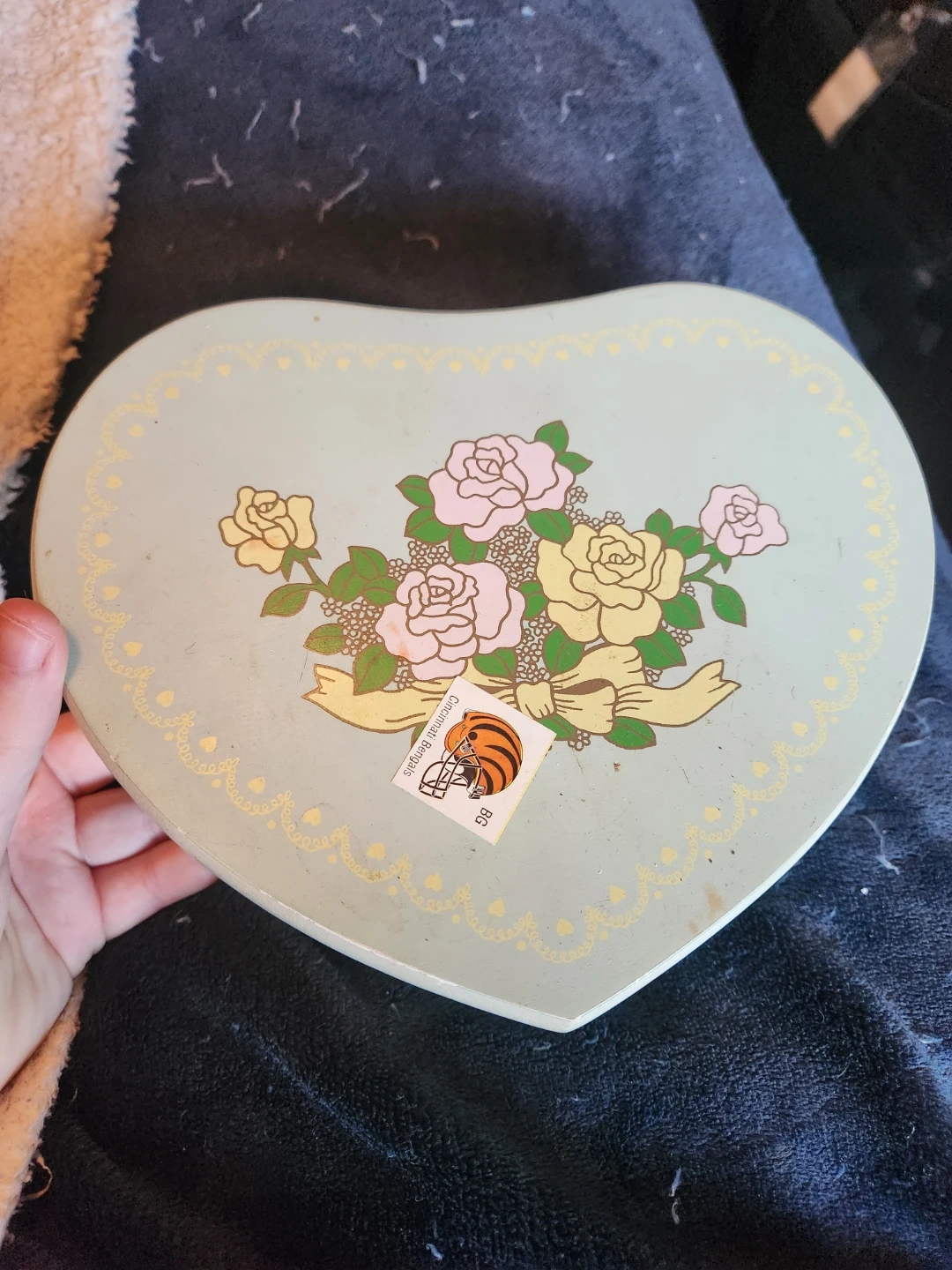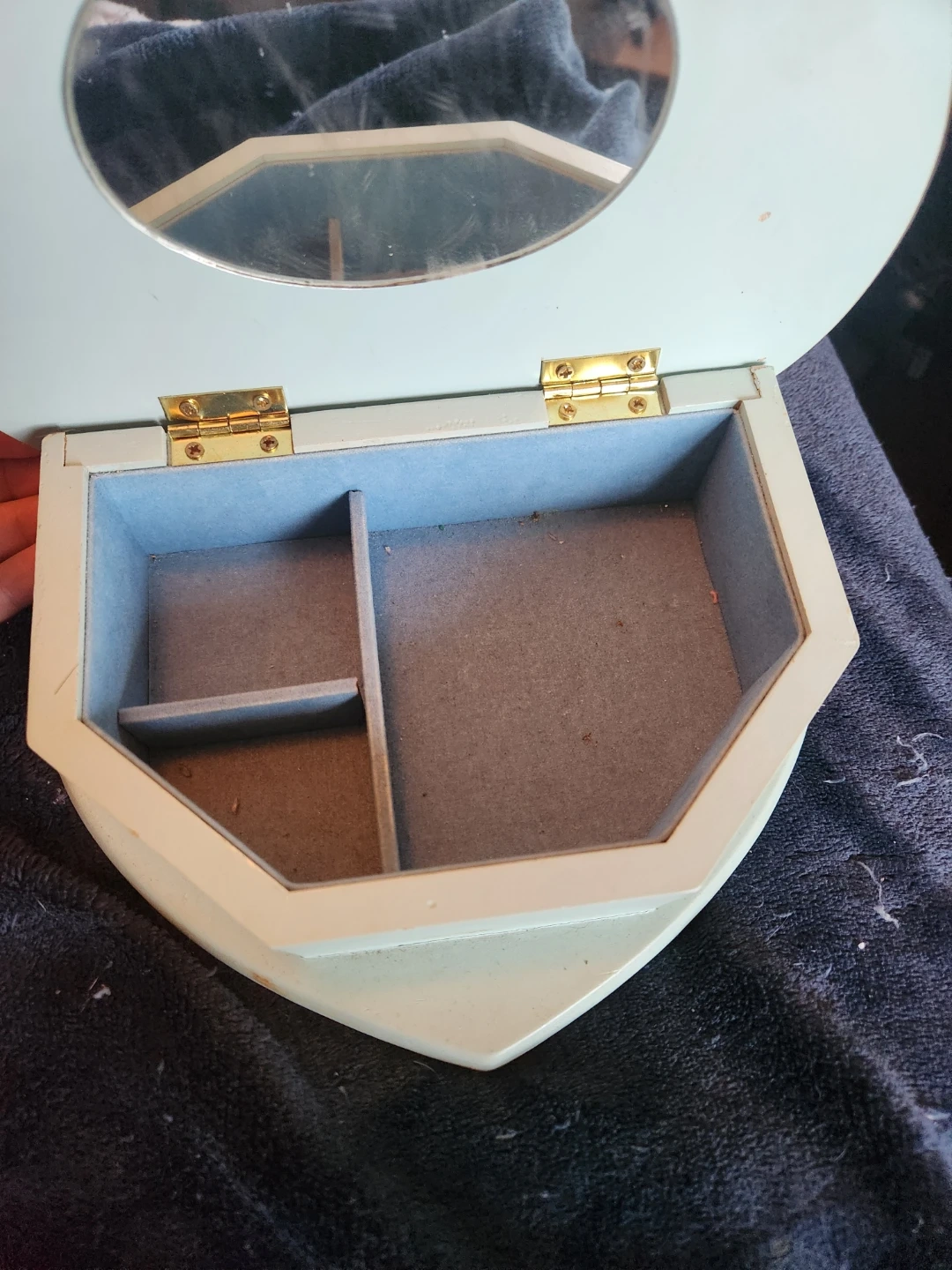 Selling a lovely vintage heart-shaped jewelry box! It's a light green colour with floral designs on top, and a mirror inside. Perfect for storing your precious items