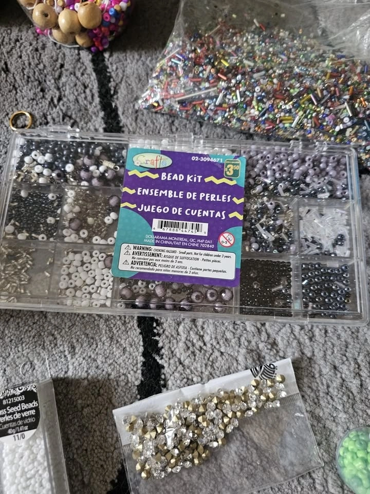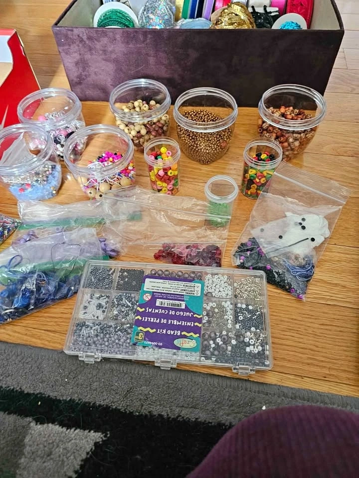 Mainly new items for crafts. Worth more than $350. Some beads have been used. The ribbons are new and only few were used sparingly. A large variety of craft and sewing items. Lots of boxes and jars with different sizes of Beads, many colors and sizes of ribbons, lace, pendants, findings and lots more.