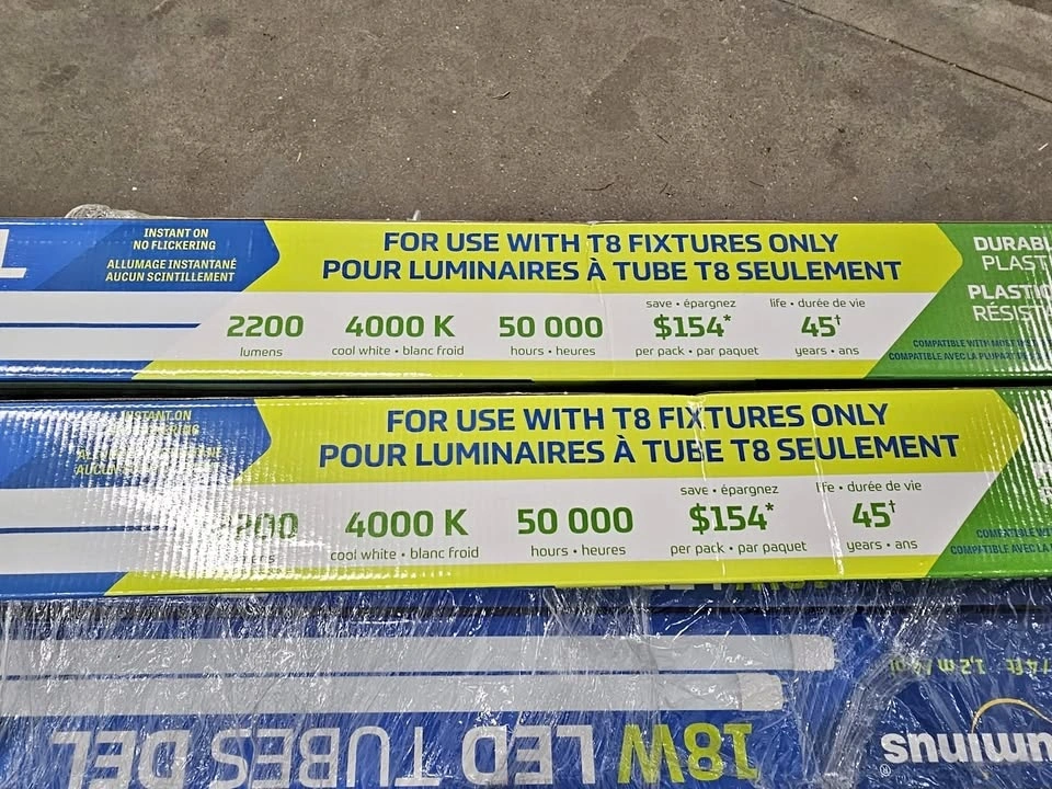 Brand New Luminus 18 W LED 4000 K Cool White -Tube Lights for T8 Fixtures. 1.2 Meters/ 4 ft , 2200 Lumens. instant on - no flickering. 32 w T8 Replacement. Plastic Resistant. Life 50,000 hours. A pack has 2 tubes. Price for each tube Is $12 . Pack of 2 is sold for $20. price reduction pack of 2 for $15