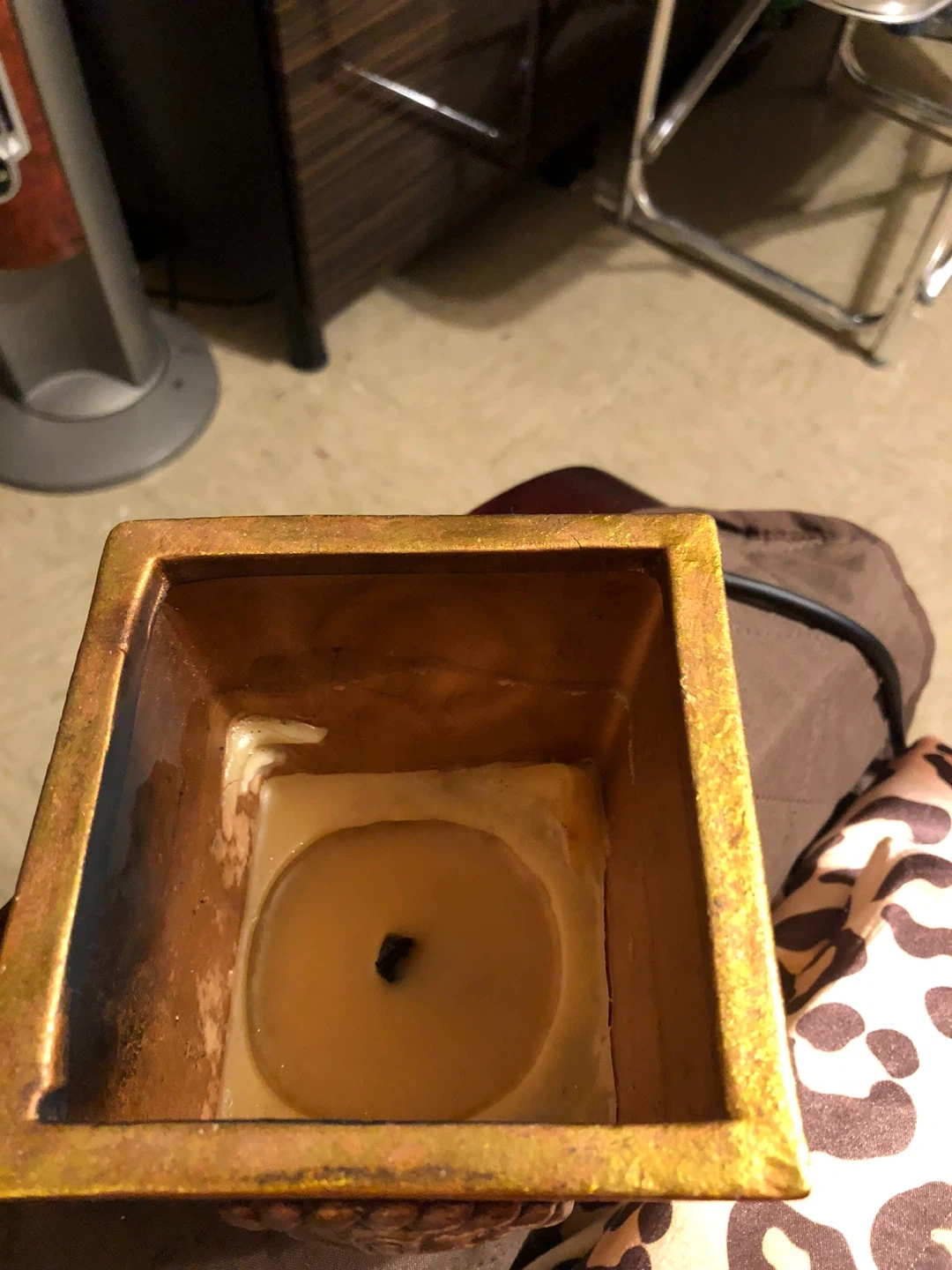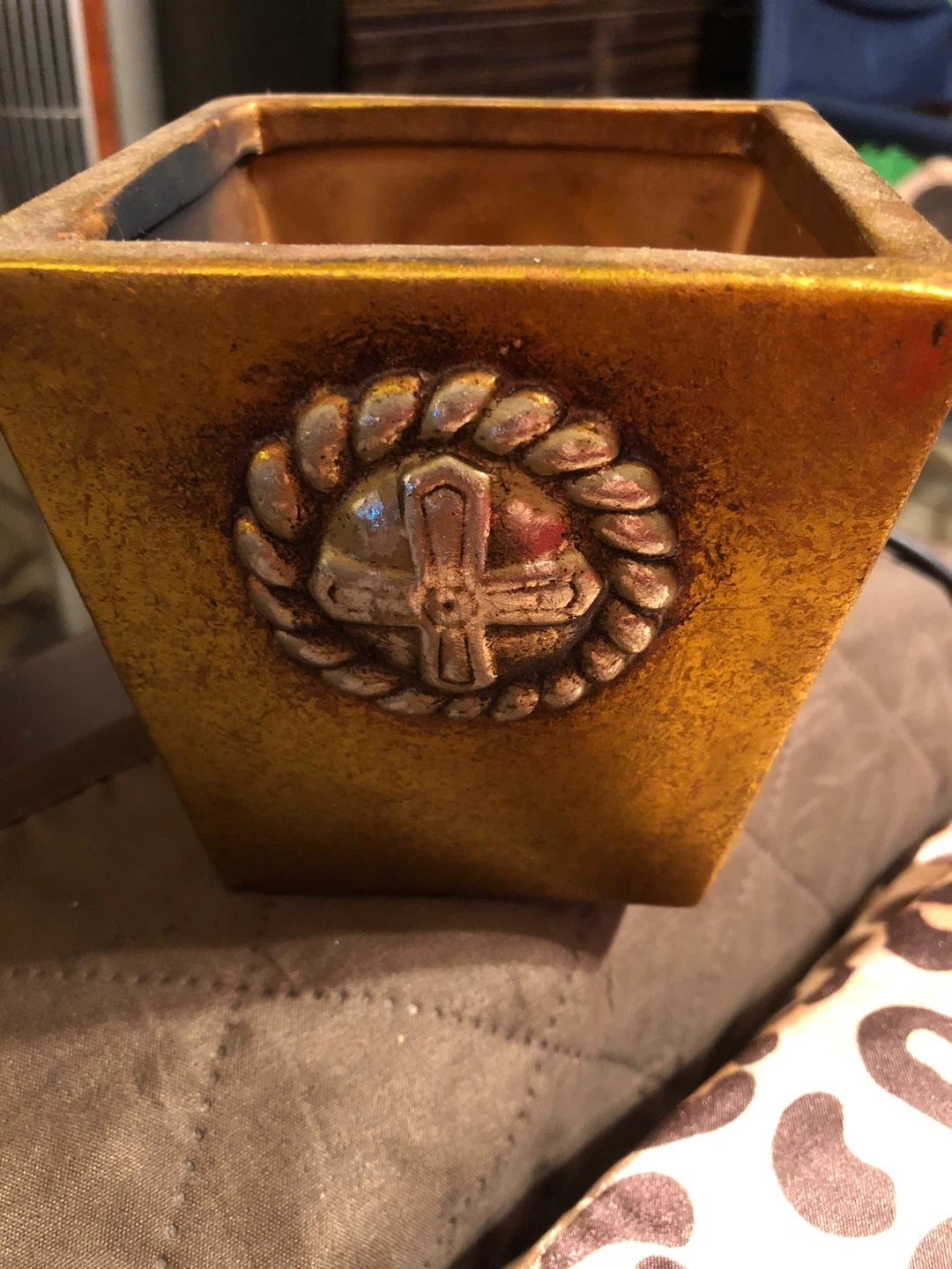 Giving a gold-colored decorative candle holder. It has a unique design on the front and would make a great addition to any room. It's in good condition and ready for a new home