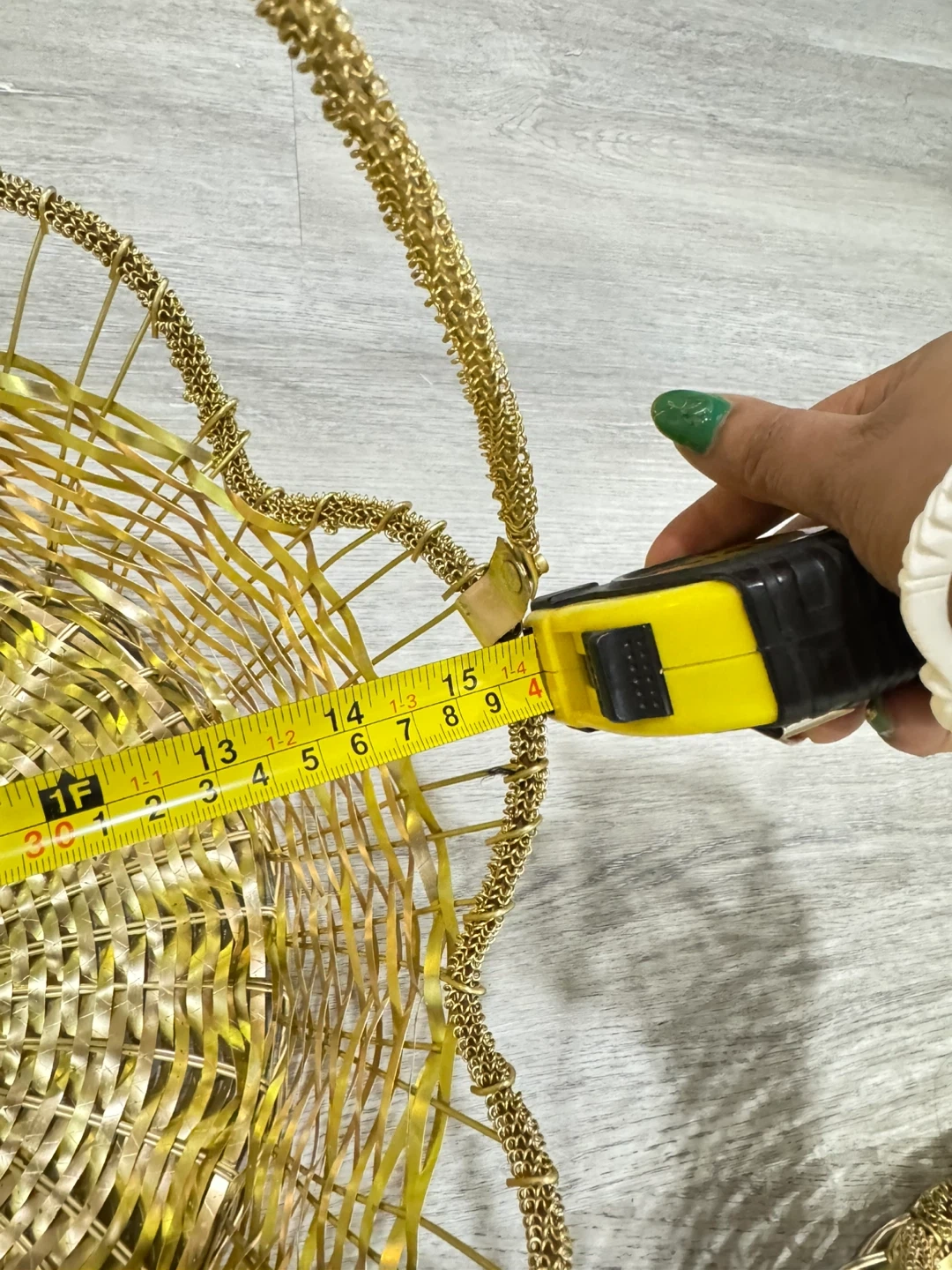 Selling a lovely gold decorative basket! It's in great condition and would look great in any room. The basket measures approximately 15 inches in diameter.