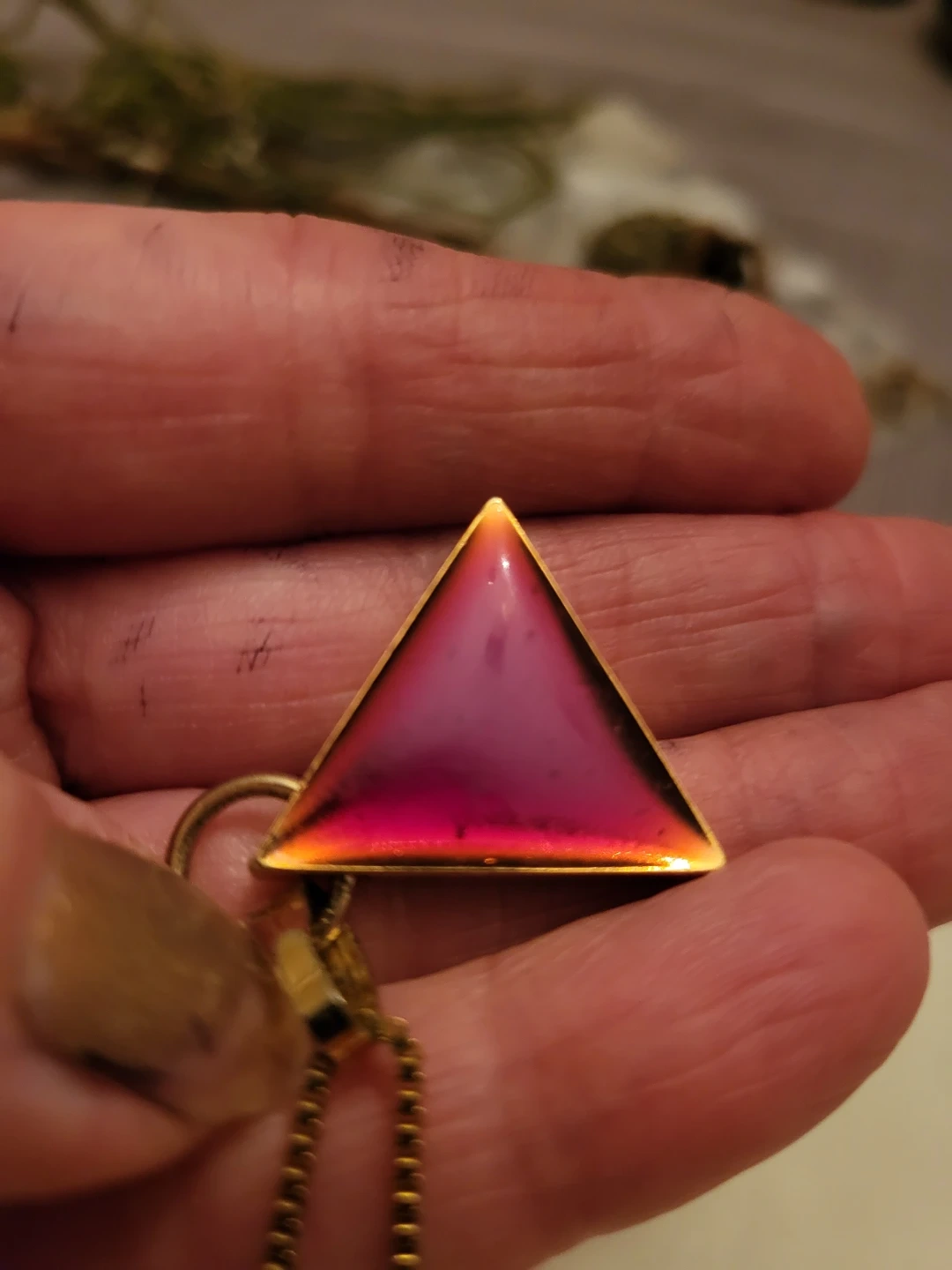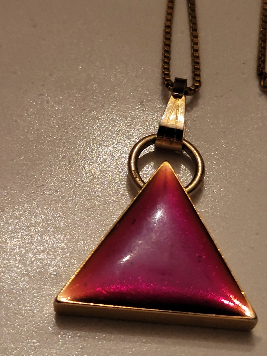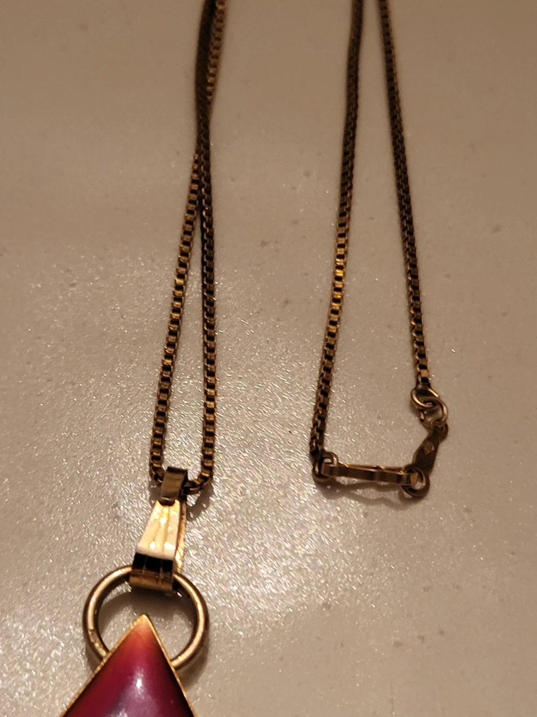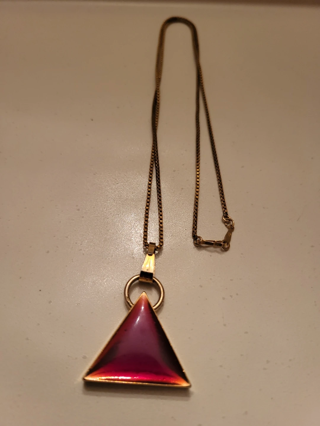 Vintage gold filled (GF) necklace with a unique triangle pendant. (Not gold filled) The pendant has a beautiful reddish-purple colour. It's a great piece to add to your jewellery collection!