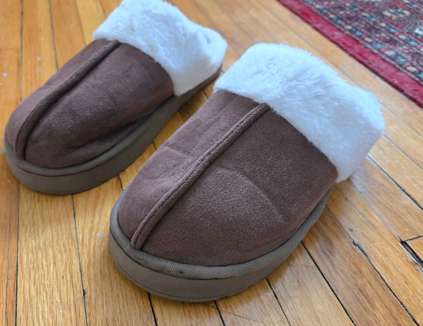 Nice shade of brown. Soft, white faux fur lining and trim and faux suede. Very comfy and in great condition. Cash and porch pick up only please. Located in central Whitby. Bought online but didn't fit me. Women's size 10. Not for narrow feet. Very lightweight.$5.00.