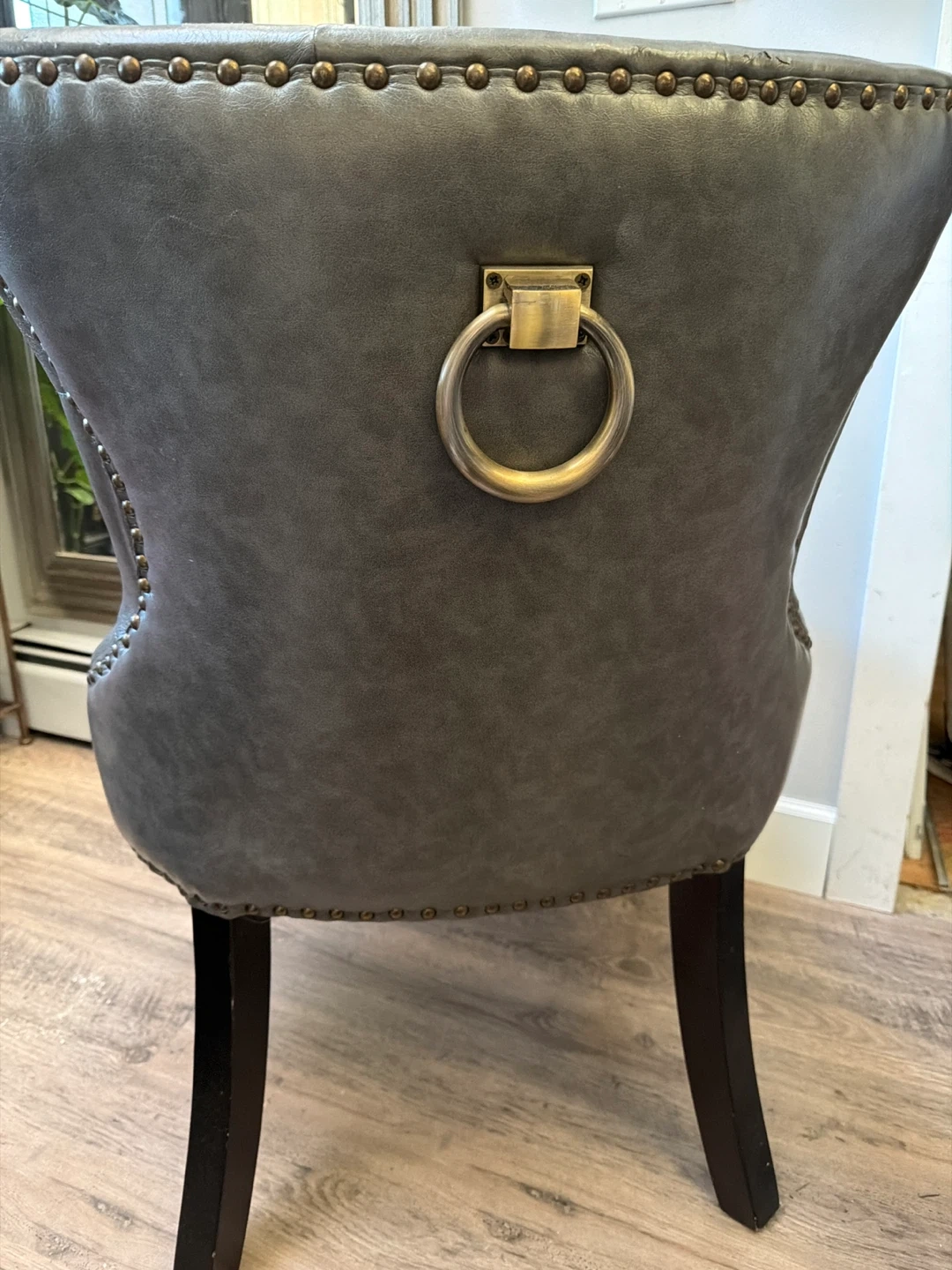 2 available $50 each or both for $90. This dining chair has seen better days, as you can see from the photos. The upholstery is peeling and worn, especially on the seat and the top corner of the back. It features a tufted back design, nailhead trim, and a ring pull on the back. Still sturdy, but needs some TLC!