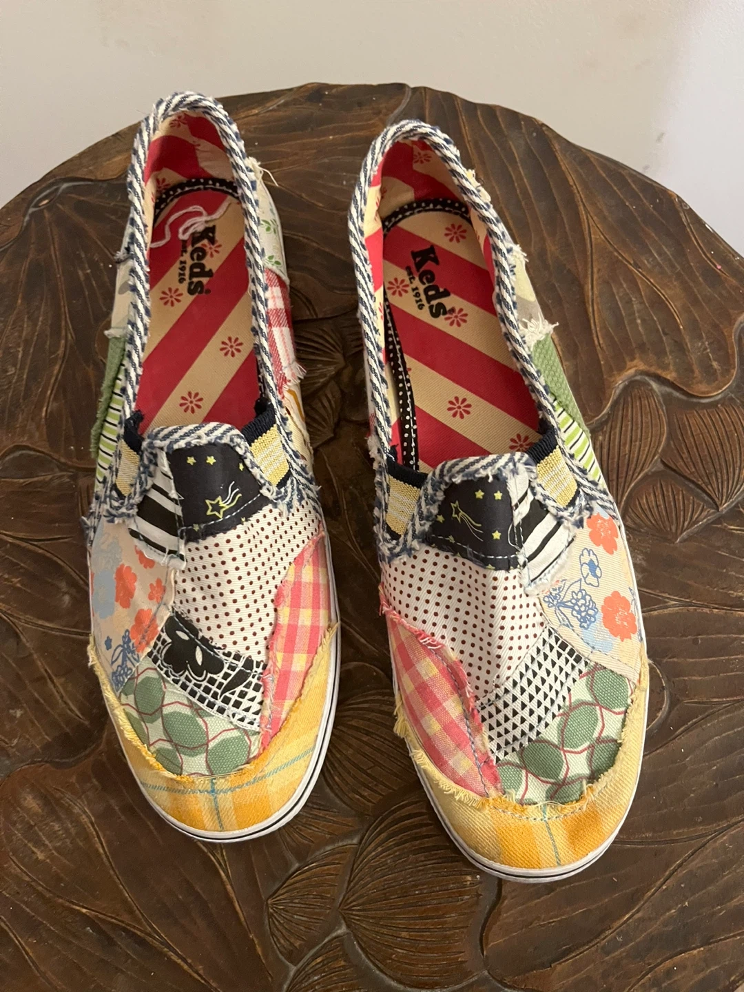 Cute Keds slip-on sneakers with a fun patchwork design! These are perfect for adding a pop of colour to any outfit. They're in great condition, ready for a new adventure