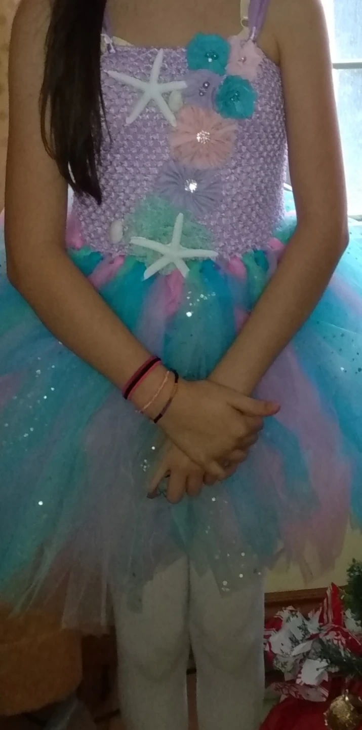 Adorable mermaid tutu dress! The dress features a crocheted bodice with starfish and flower embellishments. The skirt is made of layers of tulle in shades of blue, pink, and purple. Perfect for dress-up or a special occasion! The girl in the photo wearing it is a very skinny 12 year old the dress is size 11/12 but would probably fit any girl from 9 or 10 depending on the size of the child