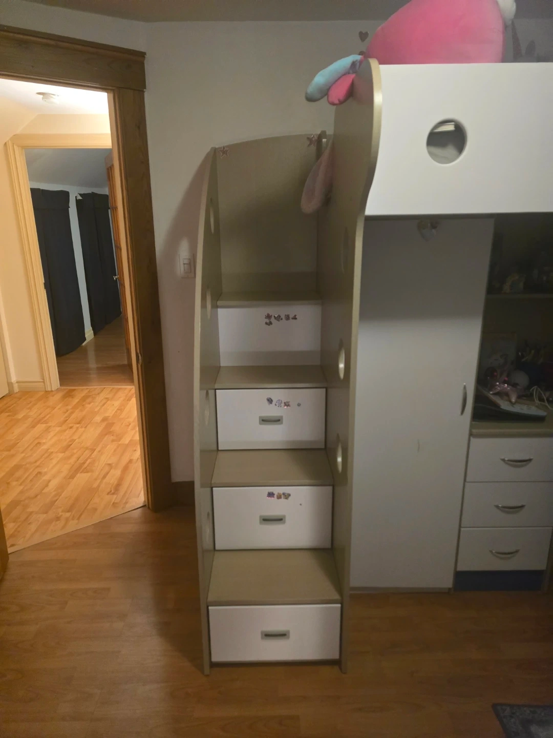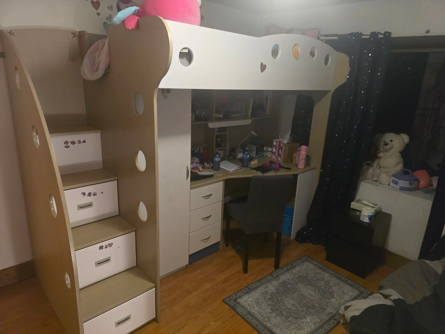 Selling a loft bed for kids! It comes with a built-in desk and storage, perfect for saving space in a smaller room. The bed has stairs with drawers for extra storage. It's in great condition and ready for a new home!