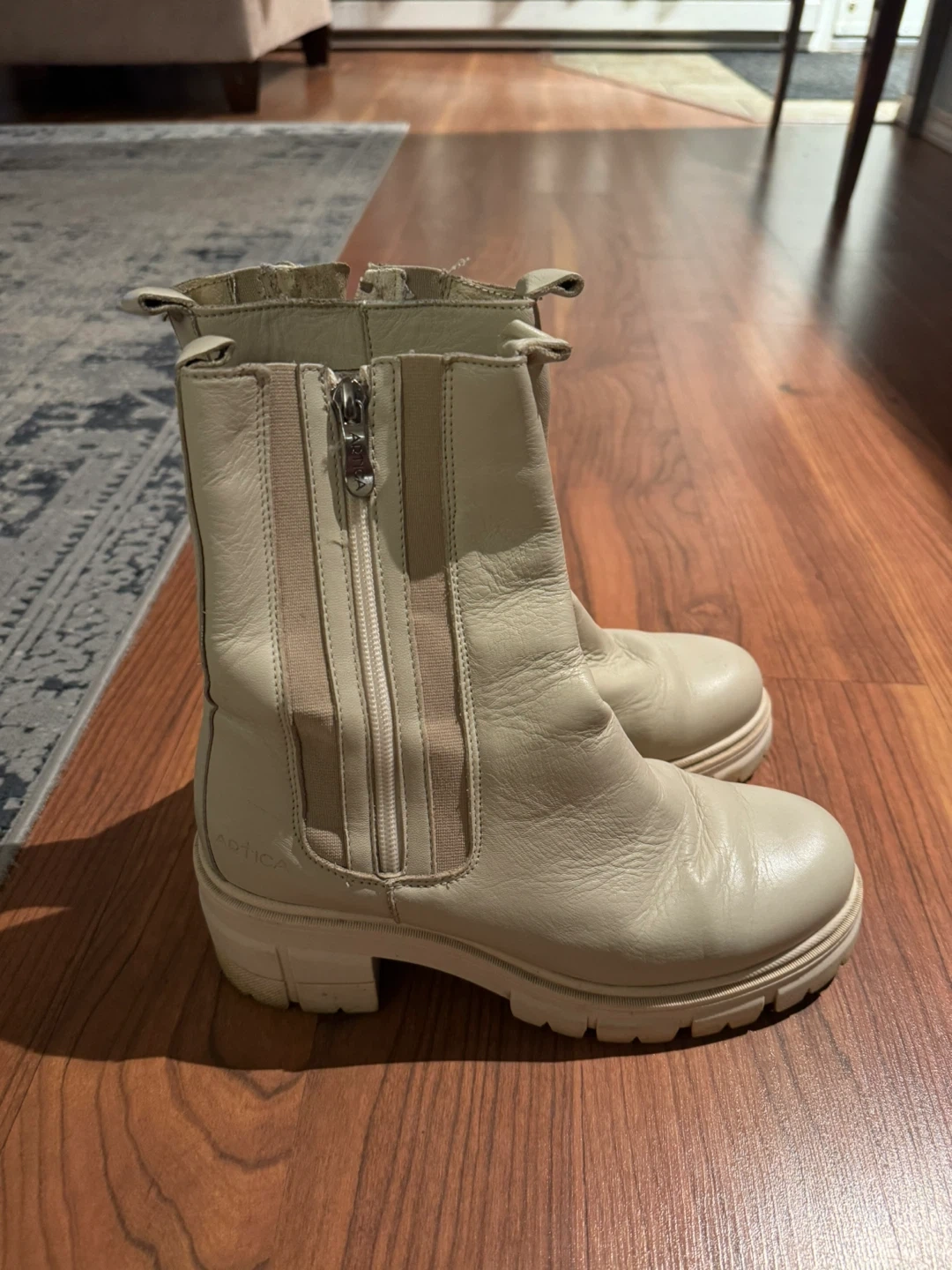 These Artica ankle boots are a stylish addition to any wardrobe! They're made of cream-coloured leather and feature a comfortable, chunky sole. Perfect for adding a bit of edge to your everyday look