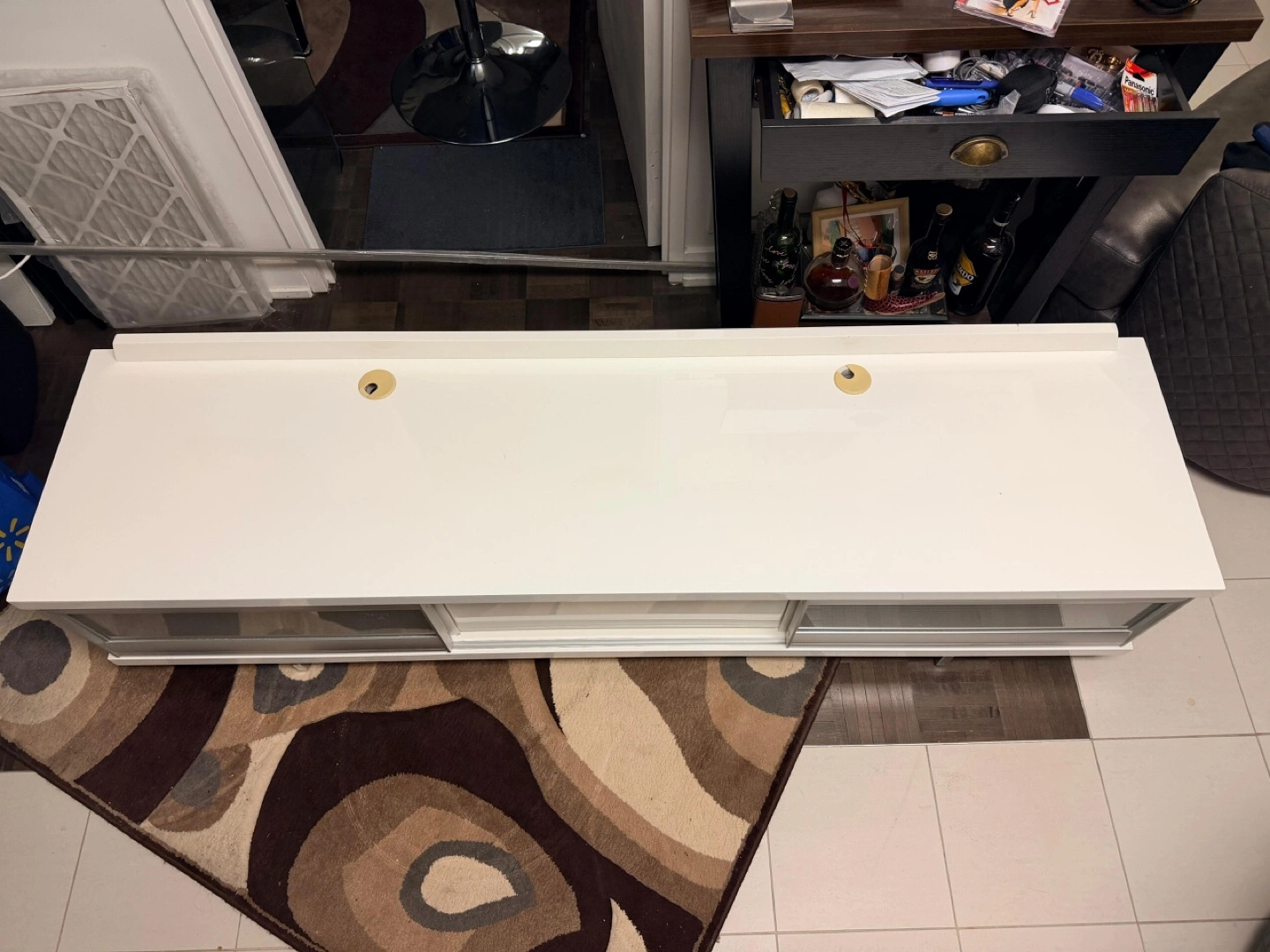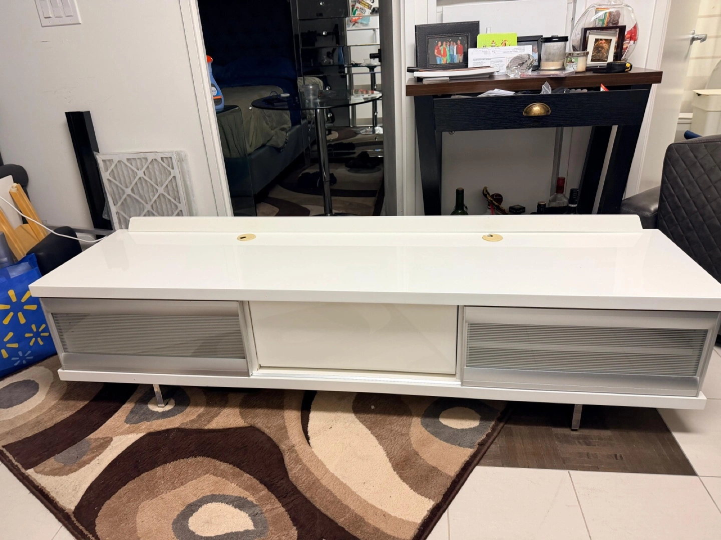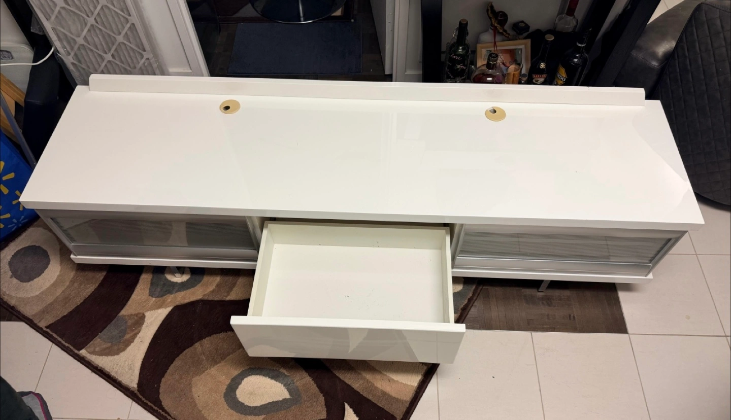 Selling a white TV stand that's in good condition. It features drawers for storage and a sleek design. Perfect for your living room setup!