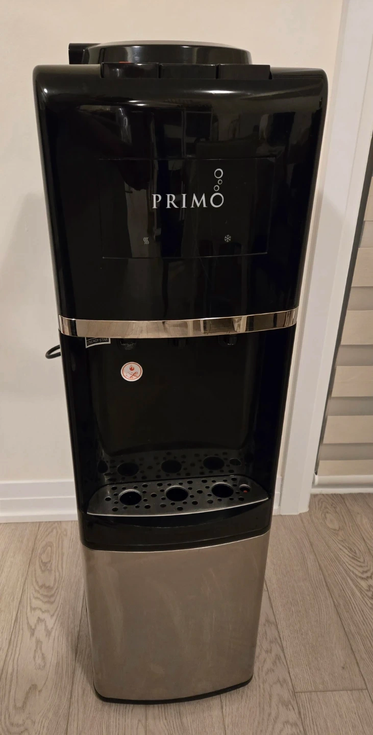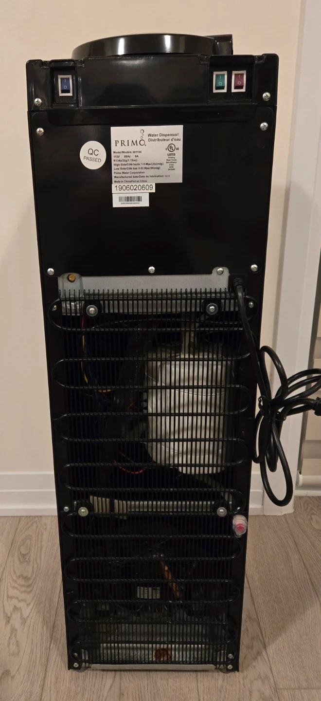Selling a Primo water dispenser in black and silver. The model number is 601166. It operates at 115V and 60Hz, using R134a refrigerant. Manufactured in June 2019