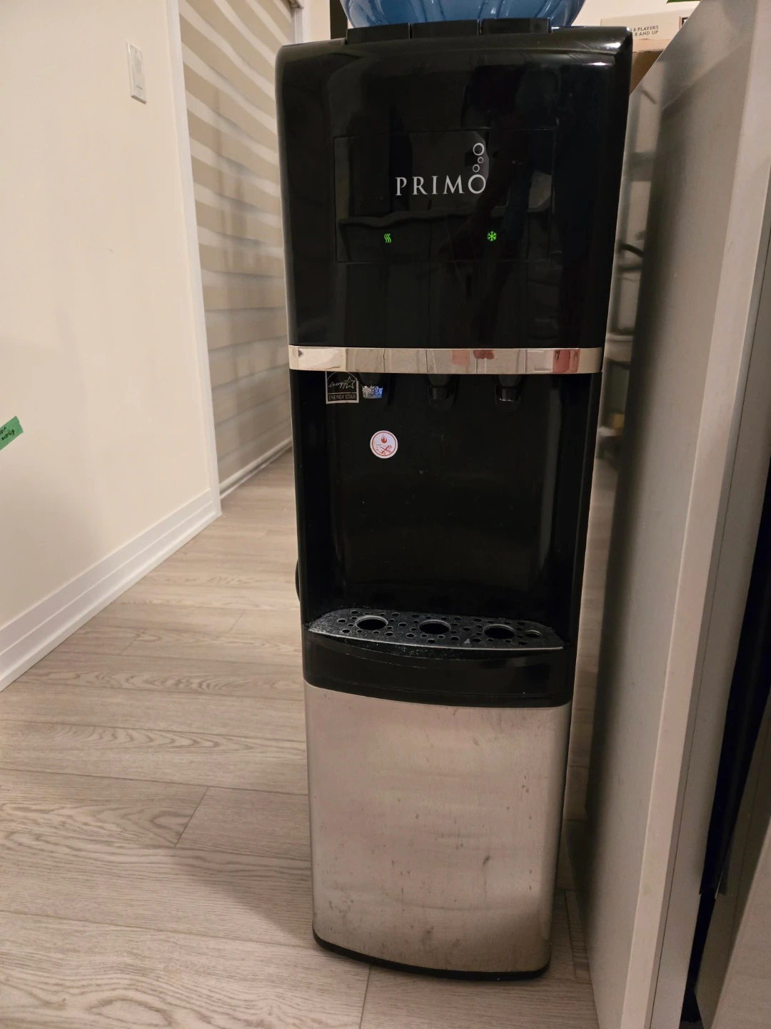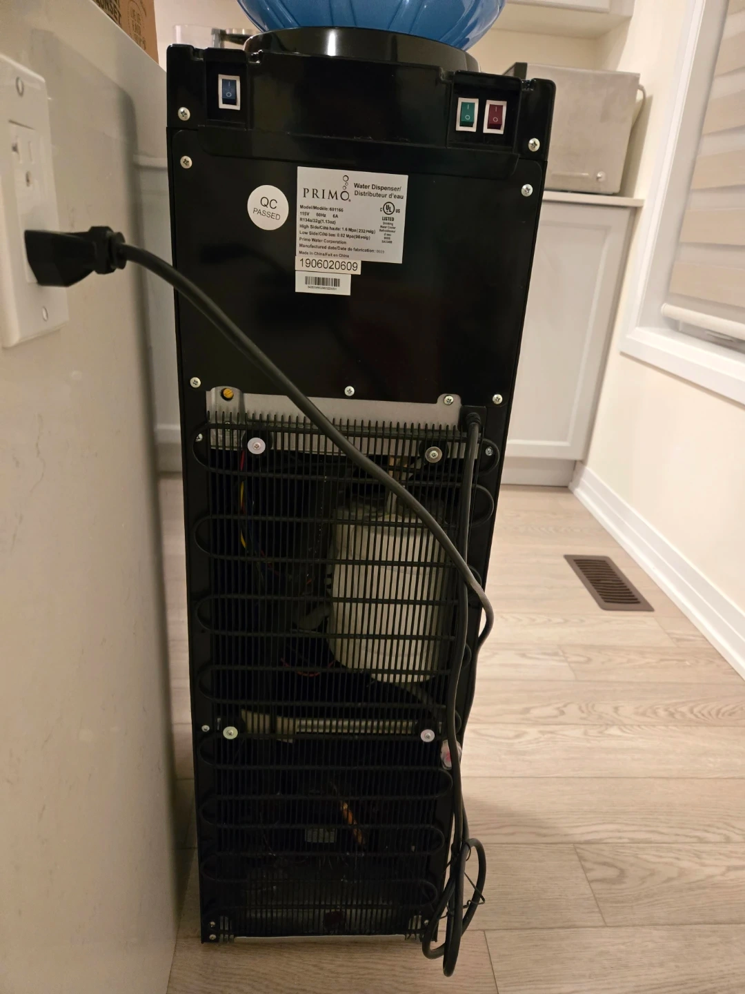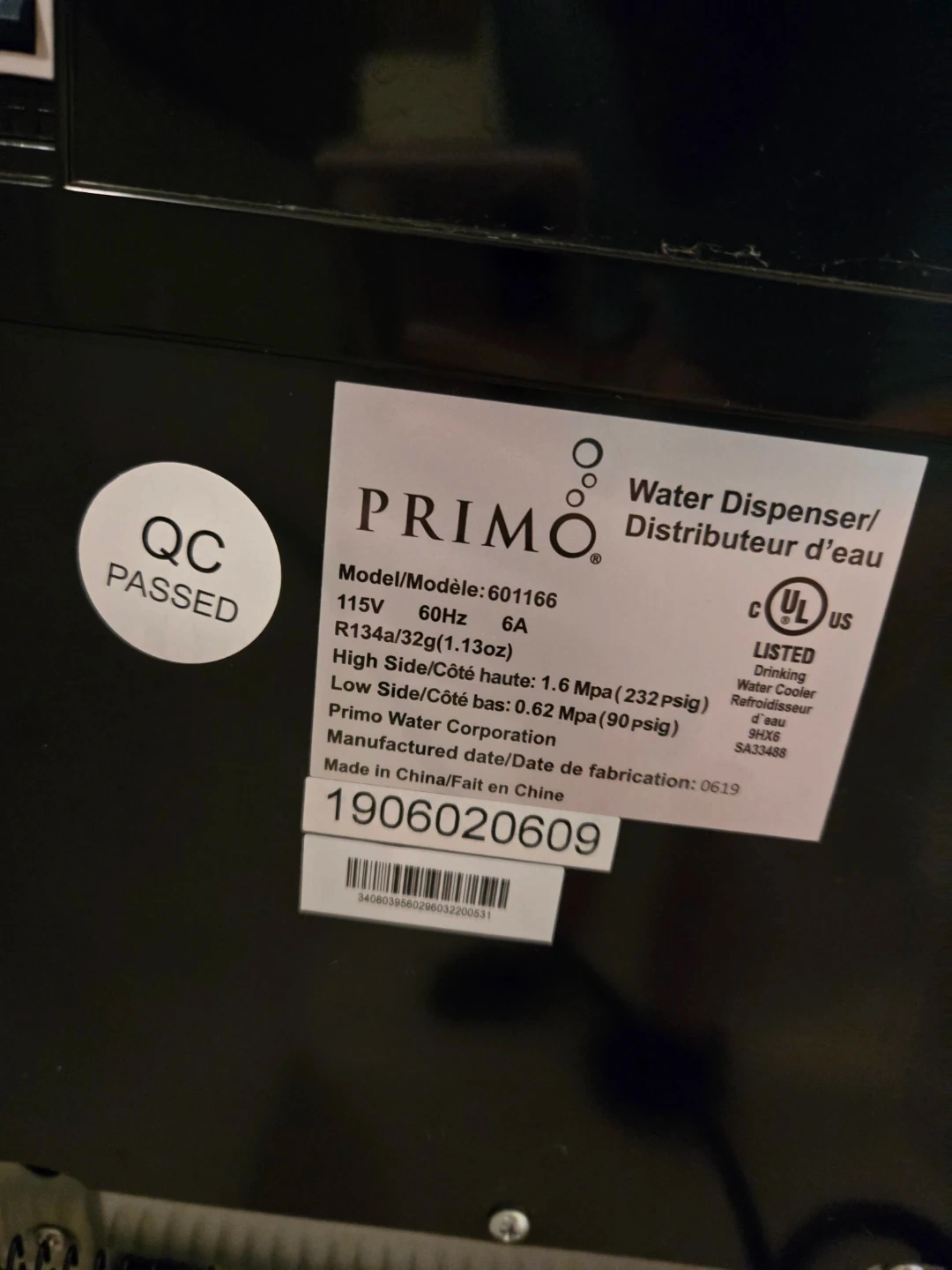 Selling a Primo water dispenser in black and silver. The model number is 601166. It operates at 115V and 60Hz, using R134a refrigerant. Manufactured in June 2019