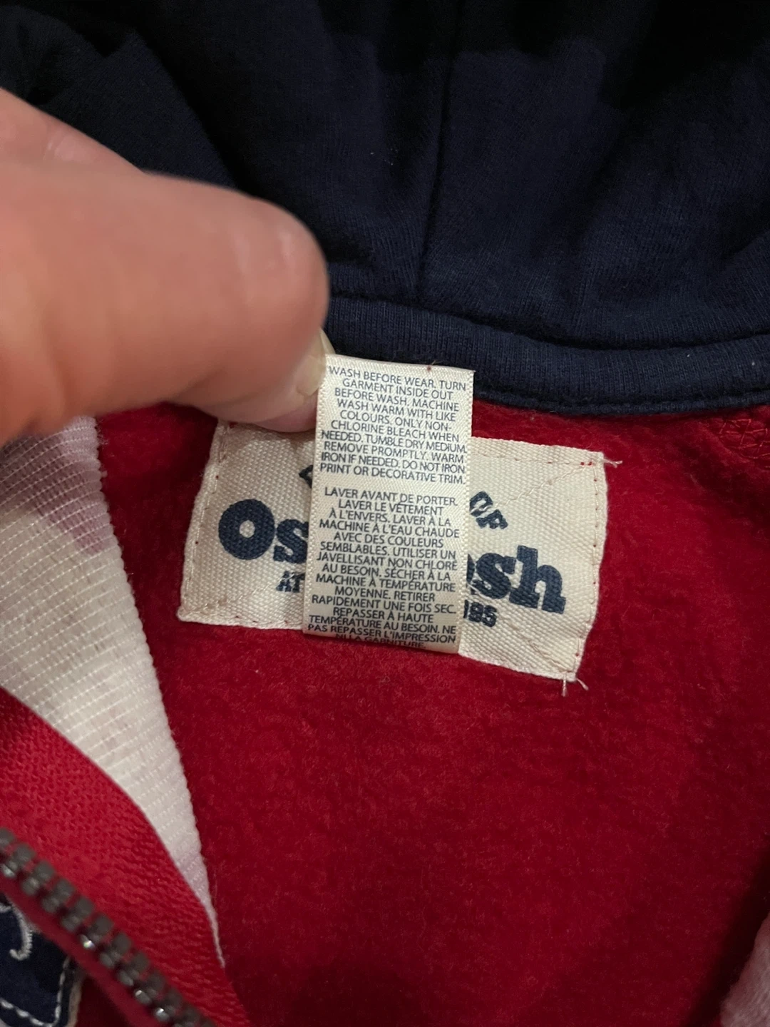 OshKosh B’gosh hooded sleeper-style onesie for baby boys size three months. Red cotton blend with front zip and embroidered logo detail. Footless design with ribbed cuffs.