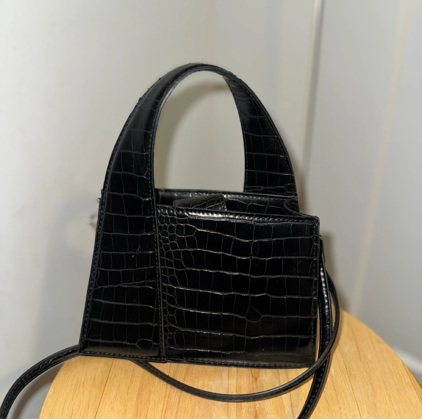 Selling a stylish black handbag with a croc-embossed texture! It's a great size for everyday use and adds a touch of sophistication to any outfit
