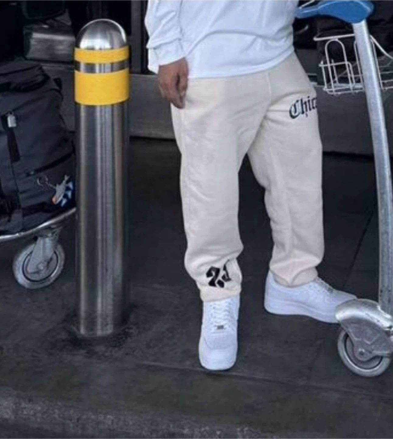 Selling a pair of MAYHEM Chicago joggers in off-white. They feature the word "Chicago" on the upper left leg and the number 23 on the lower left leg. Perfect for casual wear!