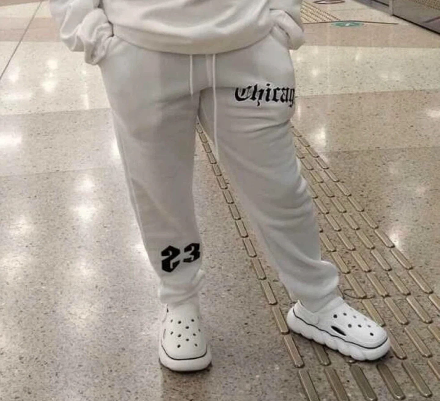 Selling a pair of MAYHEM Chicago joggers in off-white. They feature the word "Chicago" on the upper left leg and the number 23 on the lower left leg. Perfect for casual wear!