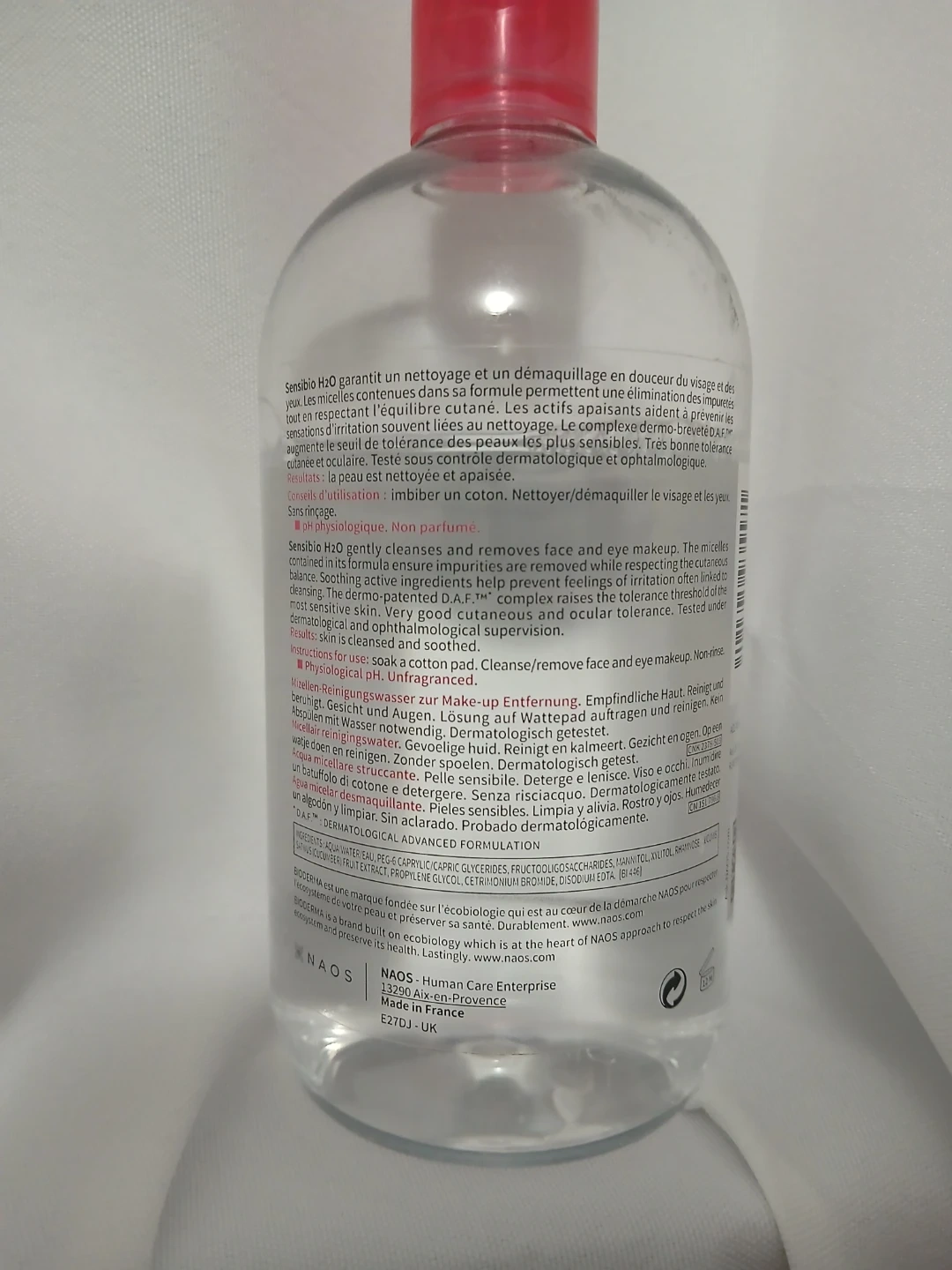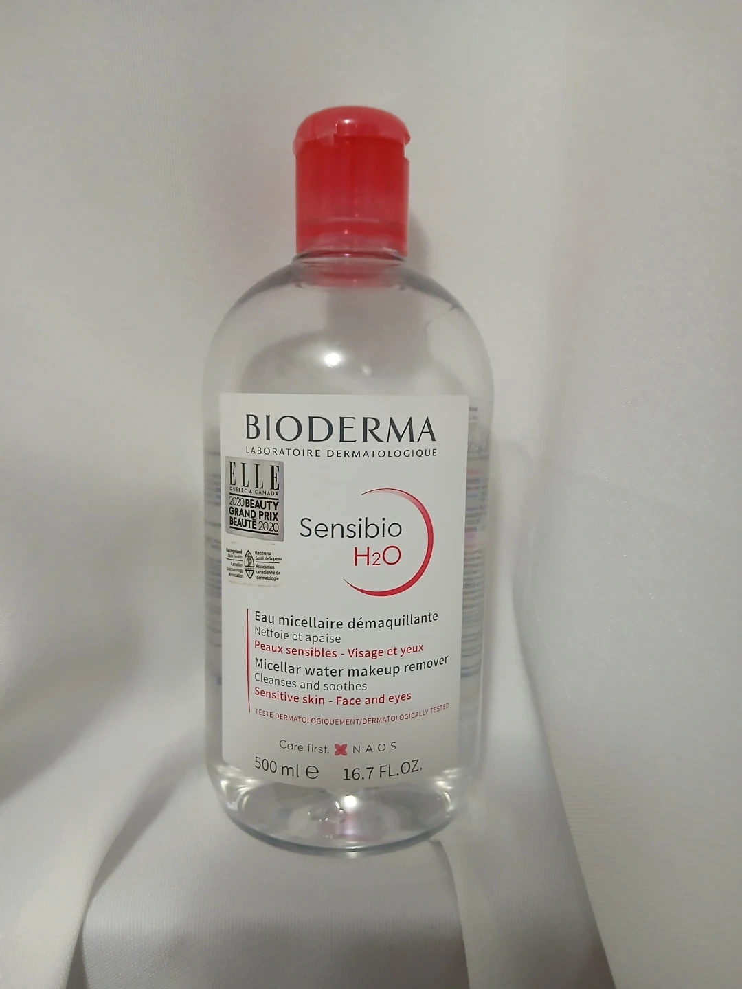 Bioderma Sensibio H2O micellar water gently cleanses and removes face and eye makeup.