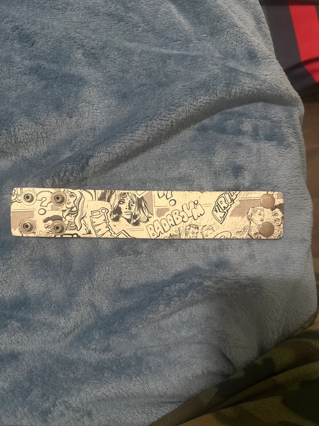 Selling a Le Chateau bracelet! One side is plain brown leather, and the other has a fun comic book design. It's in great shape and ready for a new wrist!
