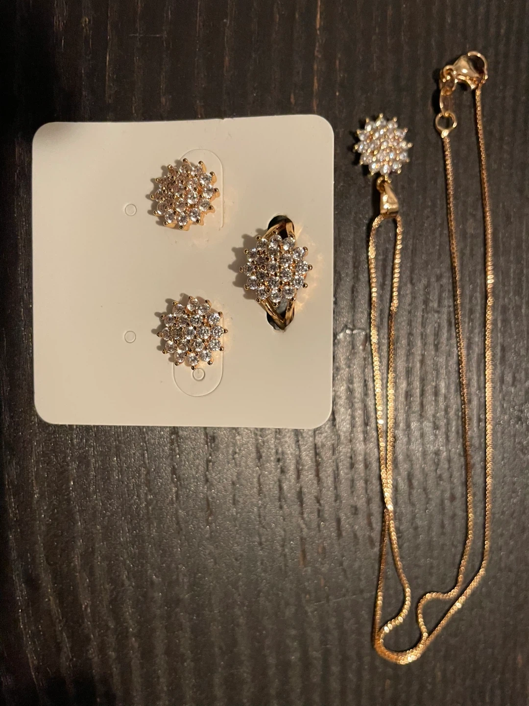 Selling a new jewellery set! The necklace measures 18 in length. They are new and they do not tarnish. Ring is adjustable