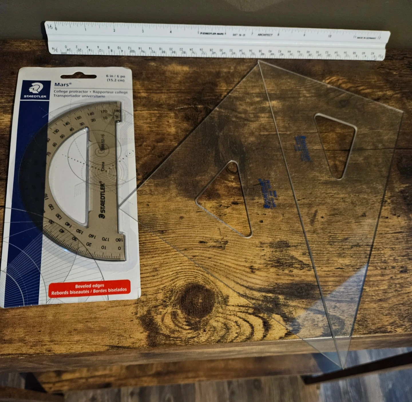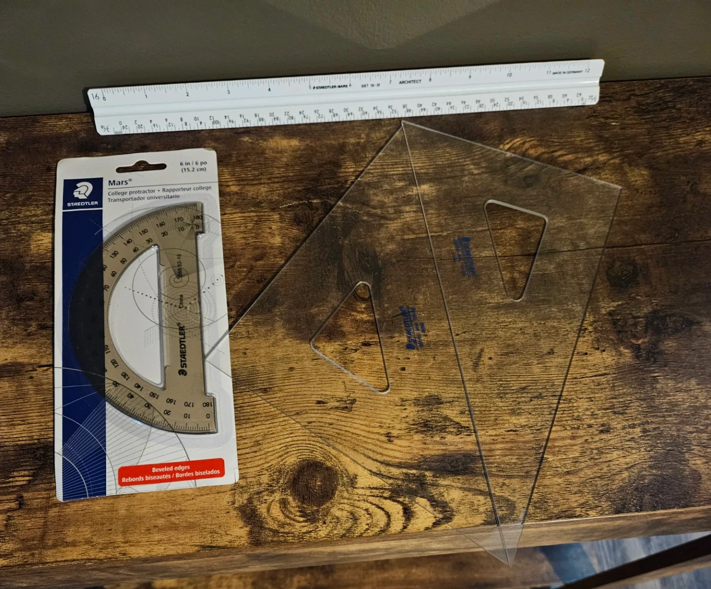 Selling a Staedtler Mars college protractor and an architect ruler. The protractor is 6 in / 6 po (15.2 cm). Great for school or drafting projects!