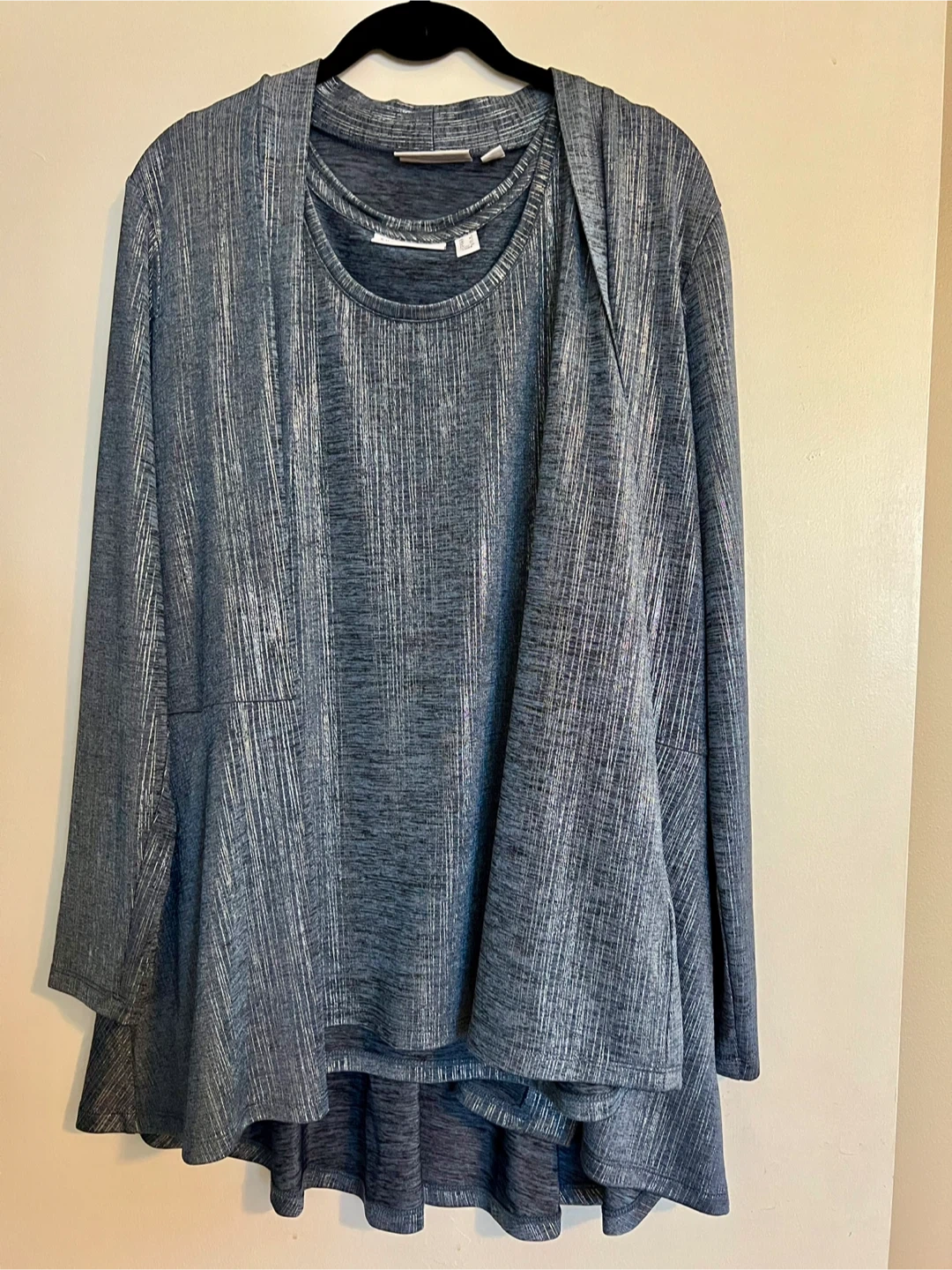 Beautiful Susan Graver Liquid Knit Blue Foil Print Cardigan Set-with sleeveless tank. Dress up & be comfy & wrinkle free (photo doesn't do it justice)