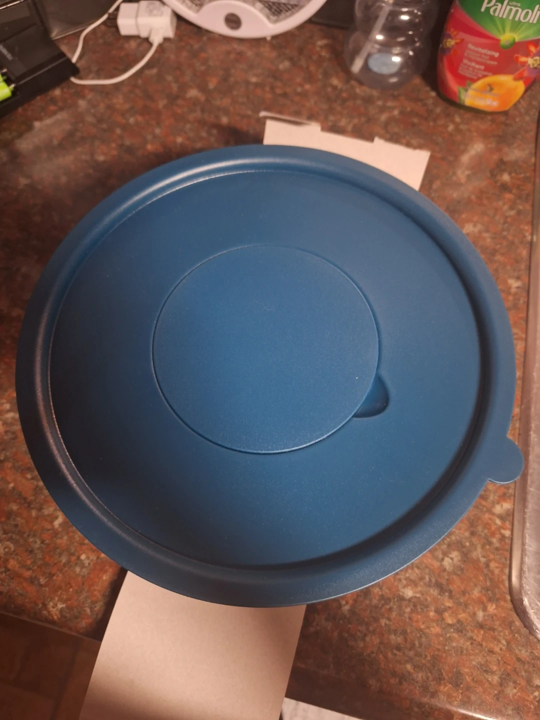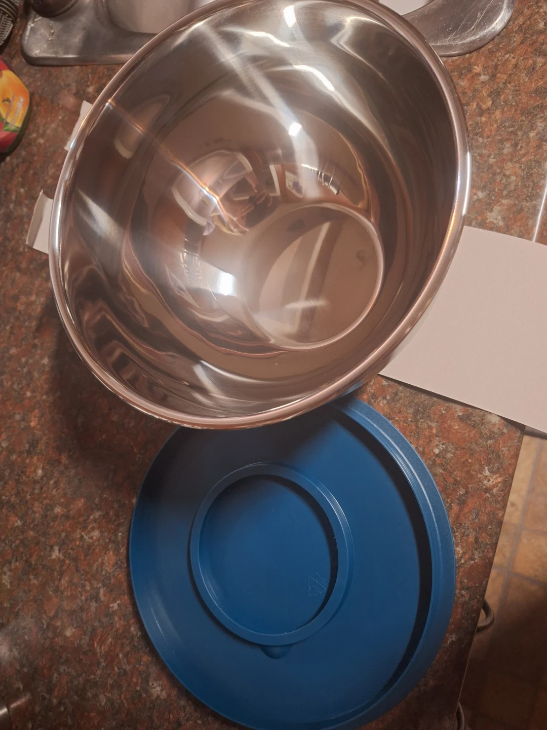 I'm selling a Kuhn Rikon mixing bowl! It's brand new and ready for a new kitchen. It's a 9.4 inch mixing bowl that is easy to clean and stainless steel. It comes with a blue lid to easily prepare, serve, and store your food. The lid has two parts, so you can use the beaters without being worried about splashing the counters or walls!