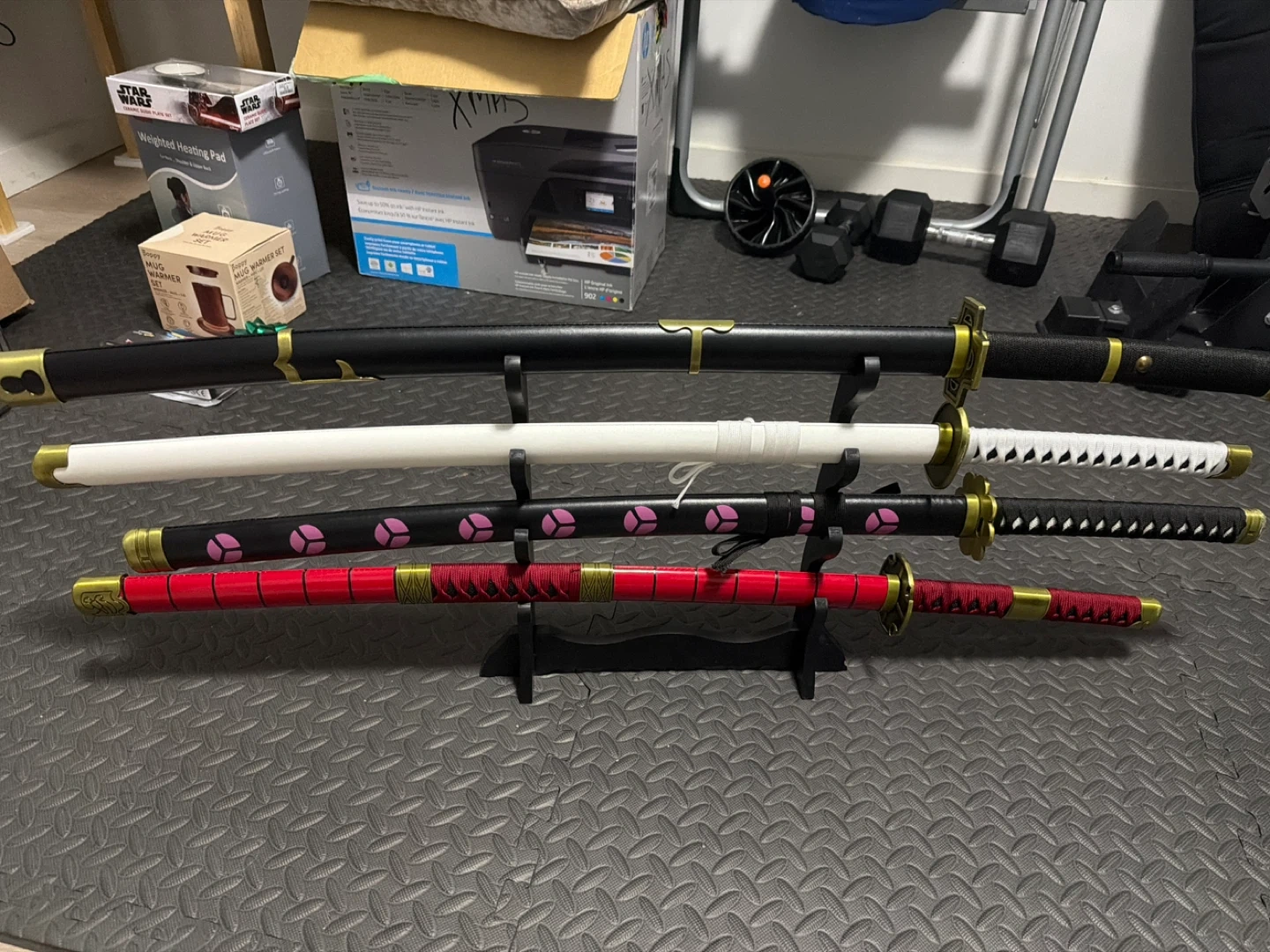 Selling a set of four anime-inspired katana swords. These decorative swords feature distinct colours and designs. Perfect for display or cosplay! Comes with stand and all four swords