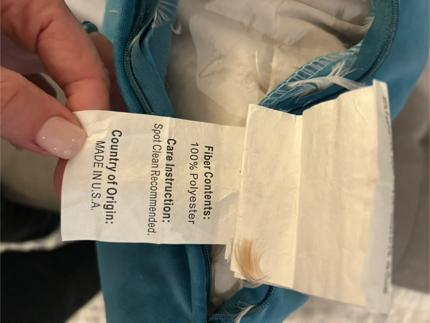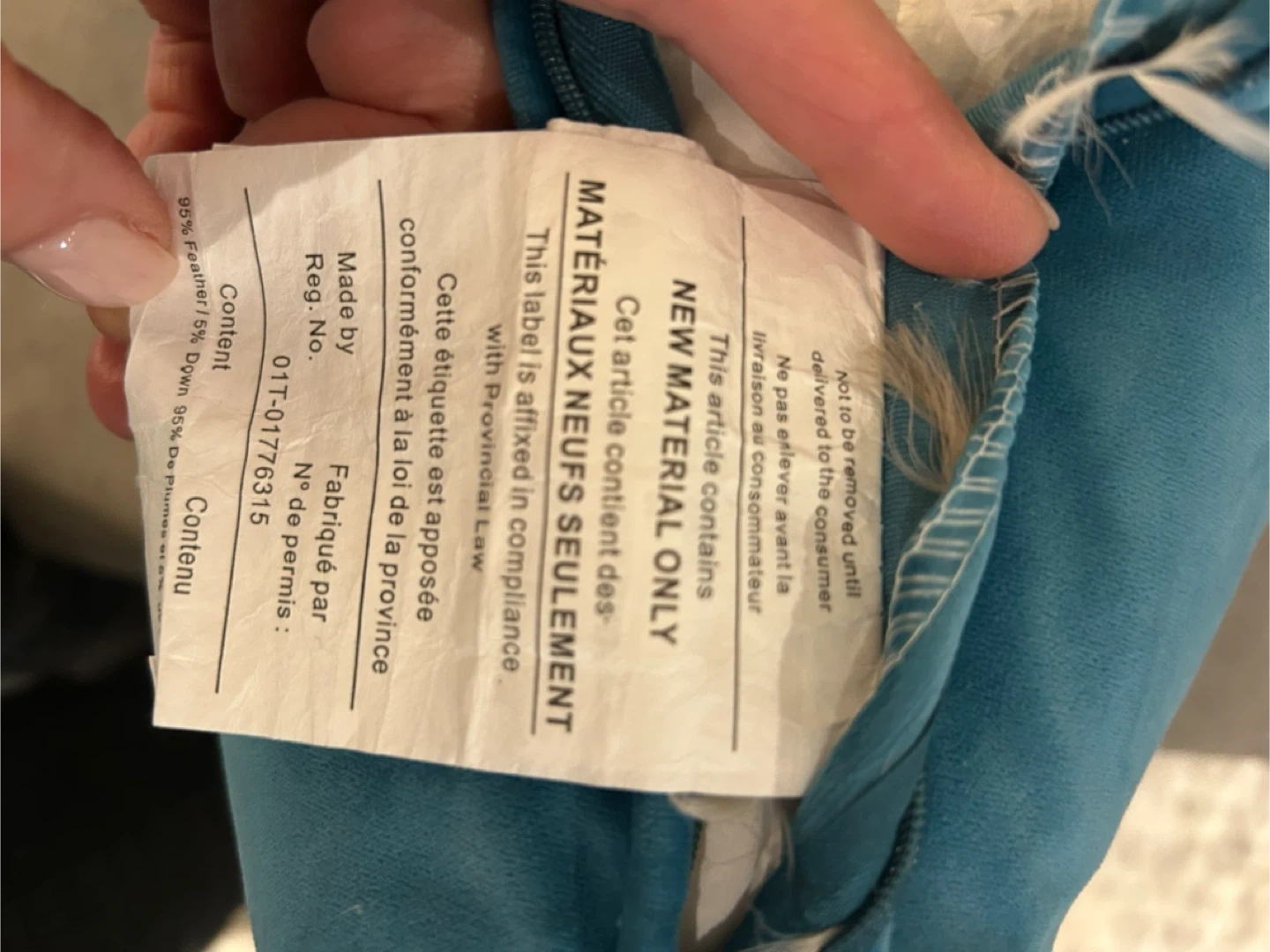 I have a set of four like new teal decorative throw pillows for sale! They are made of 100% polyester and filled with 95% feather and 5% down. Spot clean recommended. Made in the USA - 18”x18”