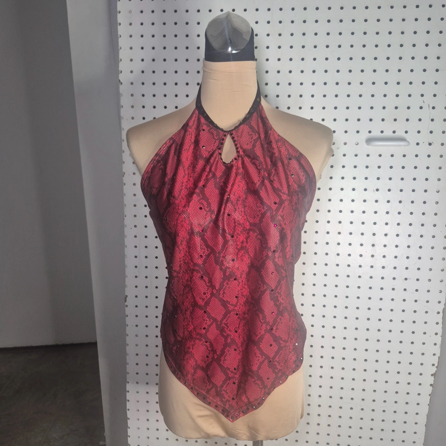 This is a red snakeskin halter top from Illusions. It has a unique design and is in great condition. Perfect for adding a touch of style to your wardrobe!