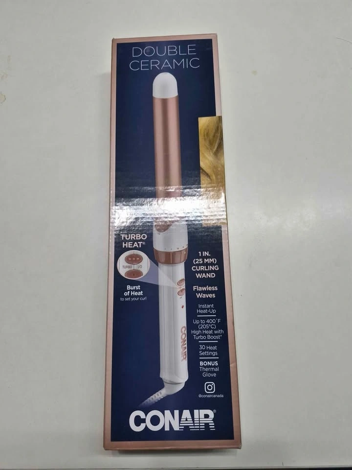 New Conair curling wand with double ceramic coating and 1-inch barrel. Has 30 heat settings and turbo boost up to 400°F. Includes thermal glove. Still wrapped in plastic and in original packaging.