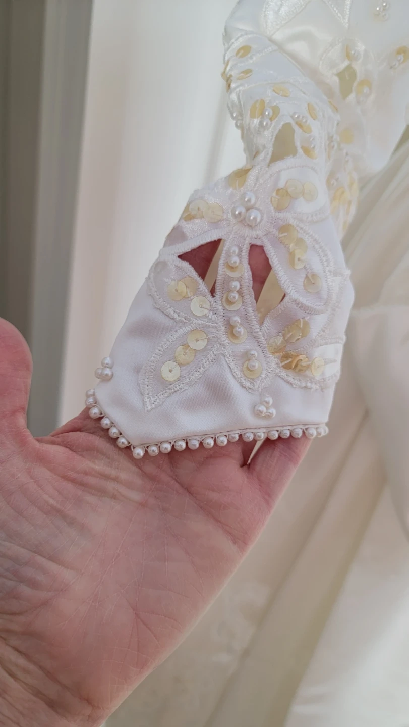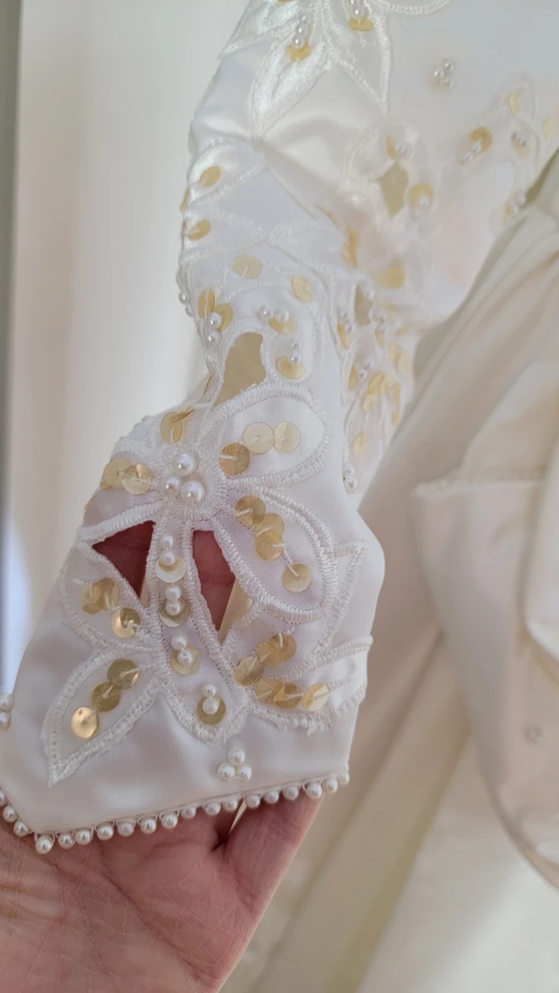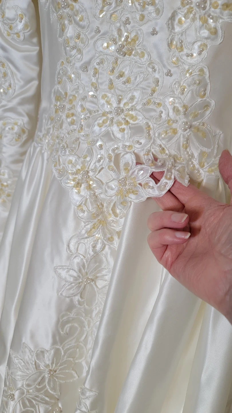 Pearls edged neckline, sleeve cuffs and bottom of dress and train.