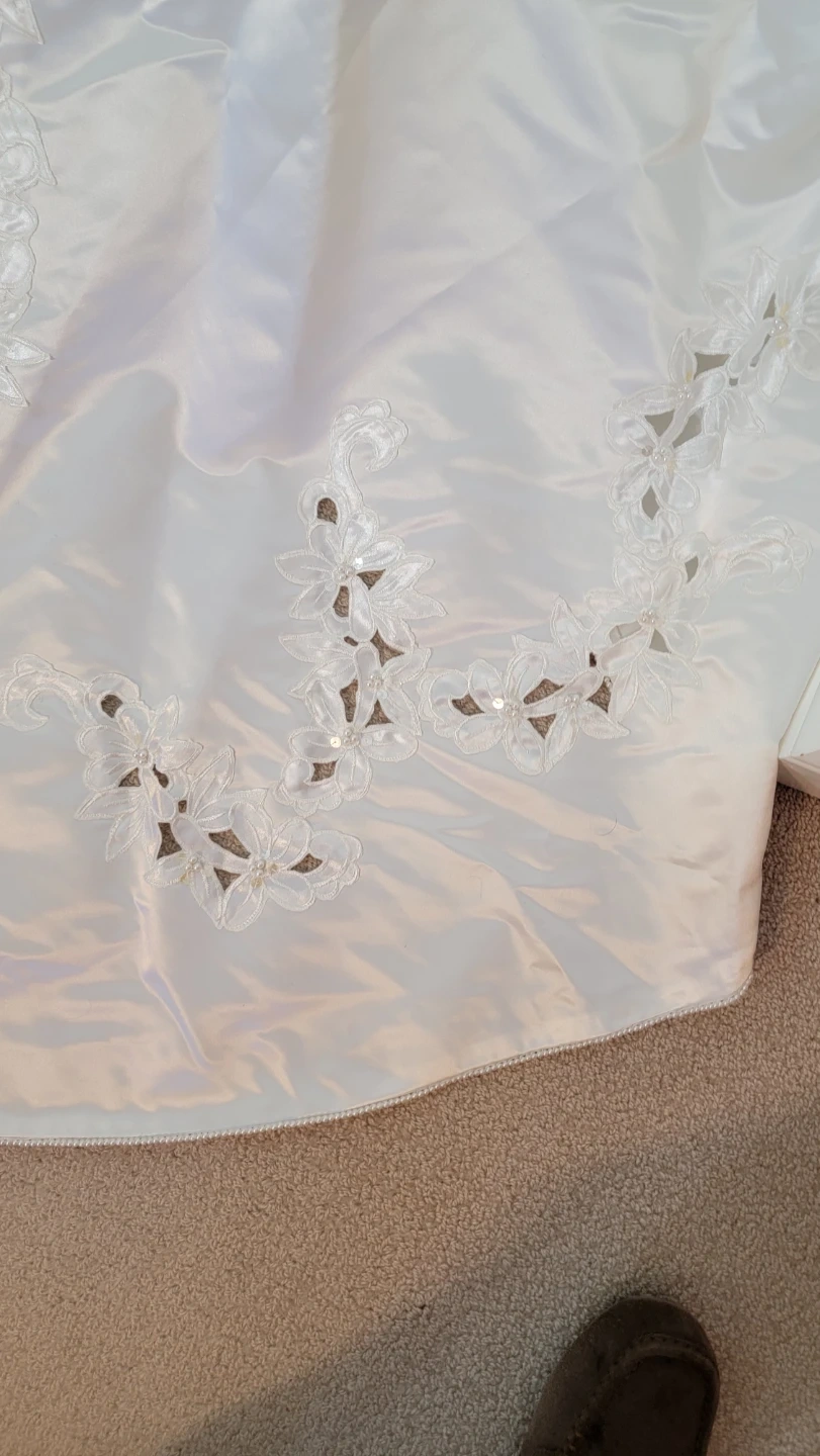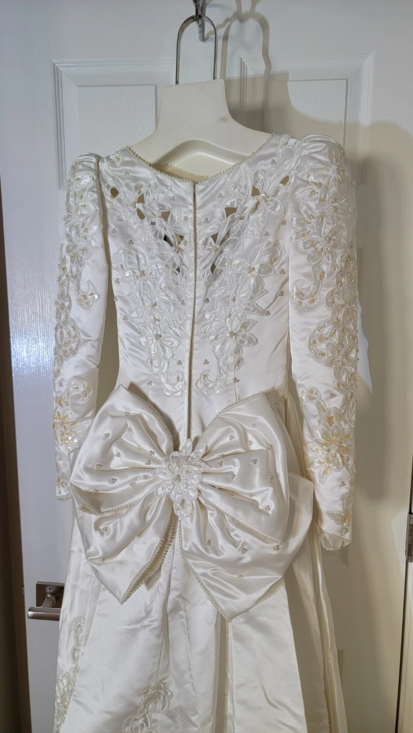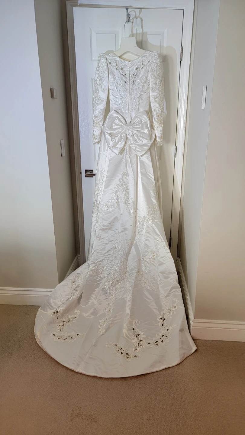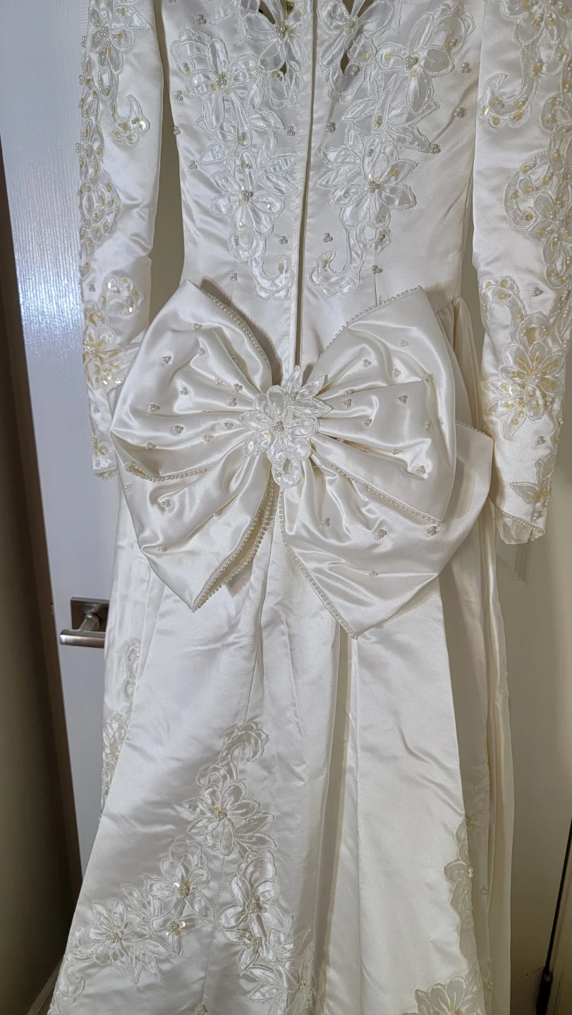 Pearls edged neckline, sleeve cuffs and bottom of dress and train.