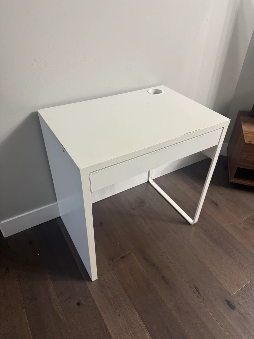Selling a white desk that's perfect for a small space. It has a handy drawer for storage and a hole for cords. There is a scratch on the top surface.
