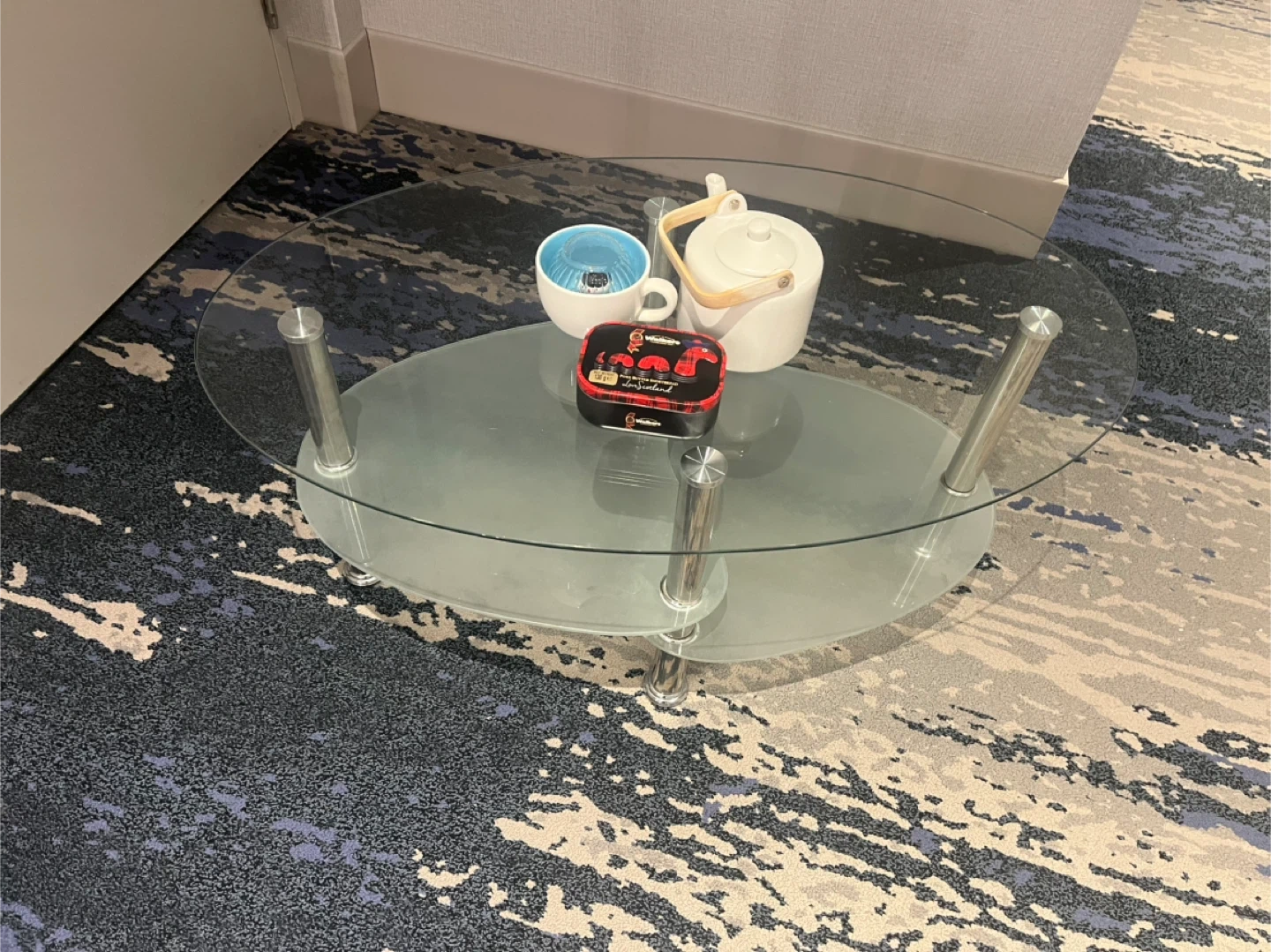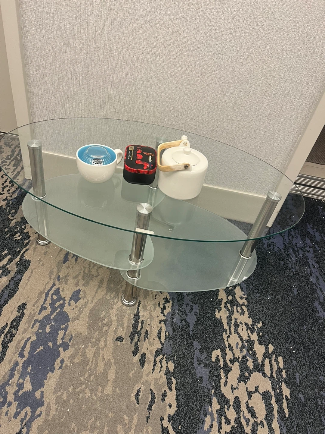Selling a glass coffee table with silver legs. It has two levels of glass, perfect for displaying items or keeping things organized. It's in good condition and would be a great addition to any living room