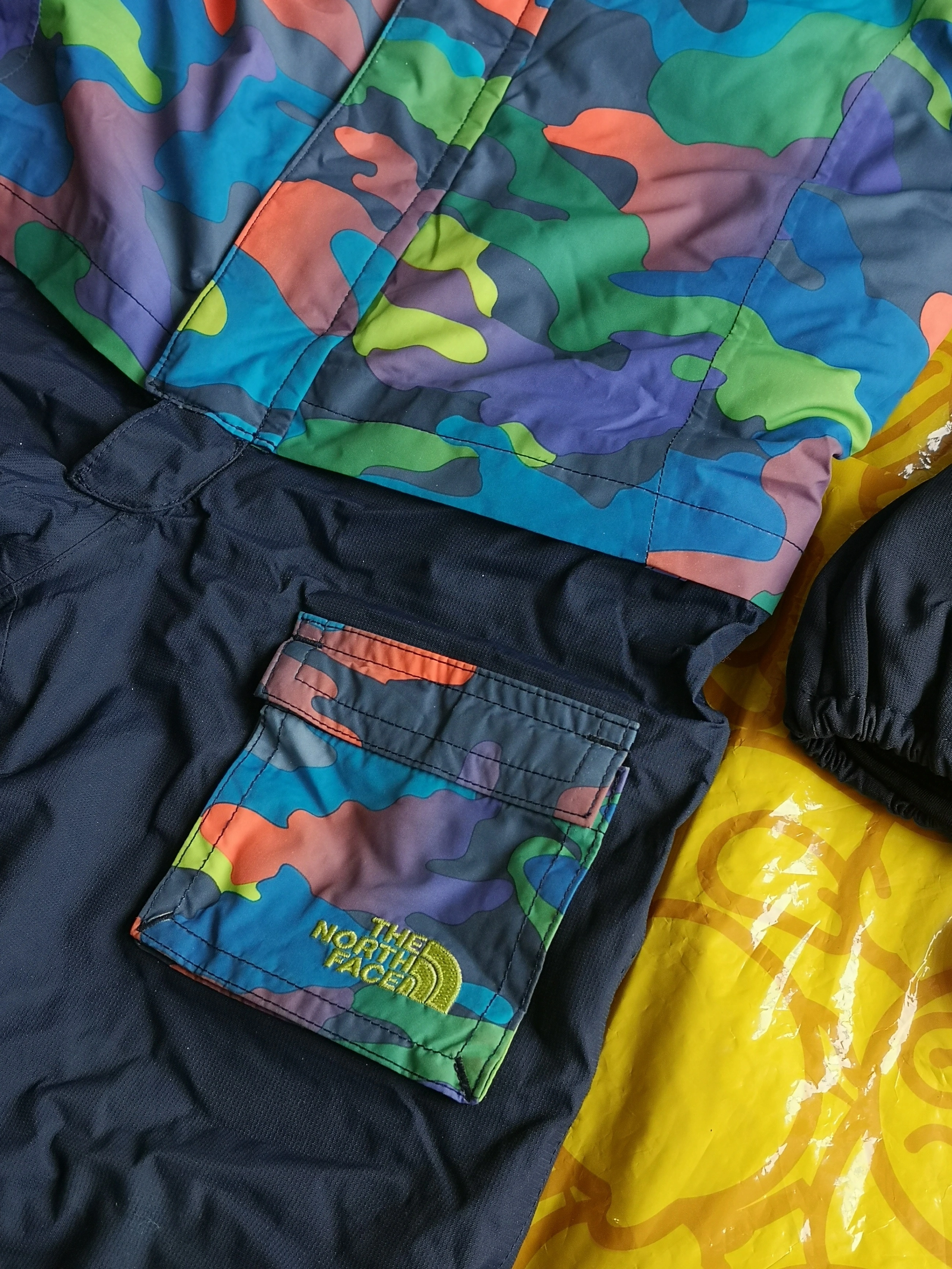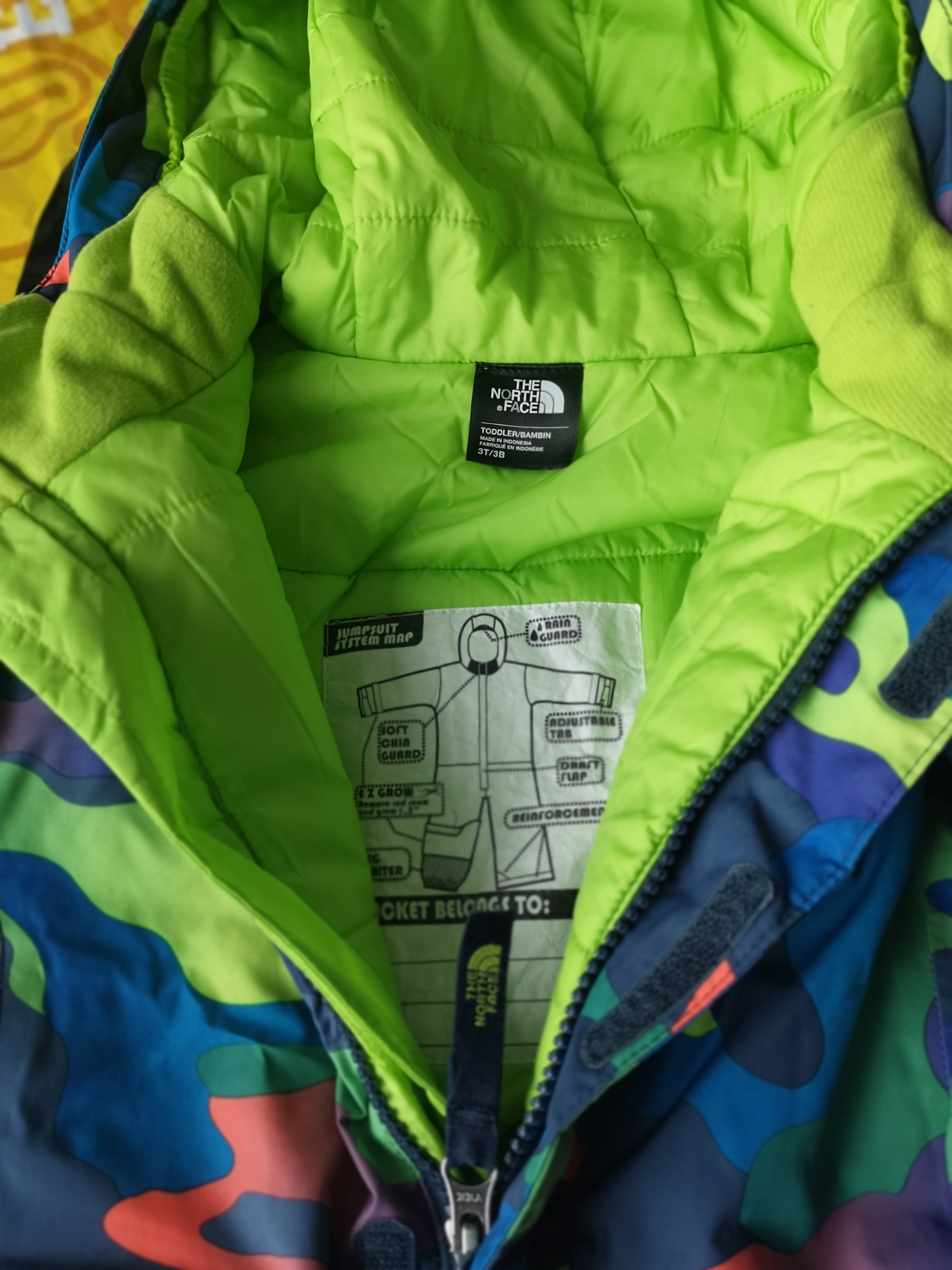 Selling a 3T The North Face toddler's snow suit with gloves, perfect for keeping your little one warm and dry this winter! A colourful camo pattern with navy blue bottom, and matching mittens. Great condition and ready for snowy adventures