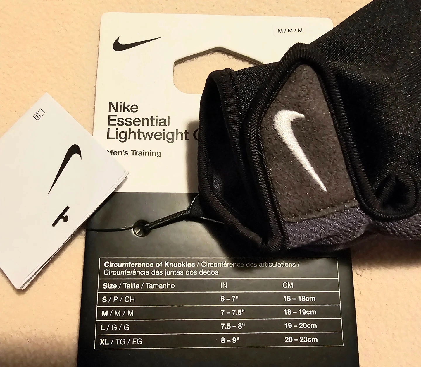 New Nike Essential Lightweight Gloves Size Medium. Perfect for men's training. Feature low-density foam and lightweight material for enhanced flexibility, along with breathable mesh to enhance airflow. Adjustable hook-and-loop wrist closure ensures a secure fit. $10