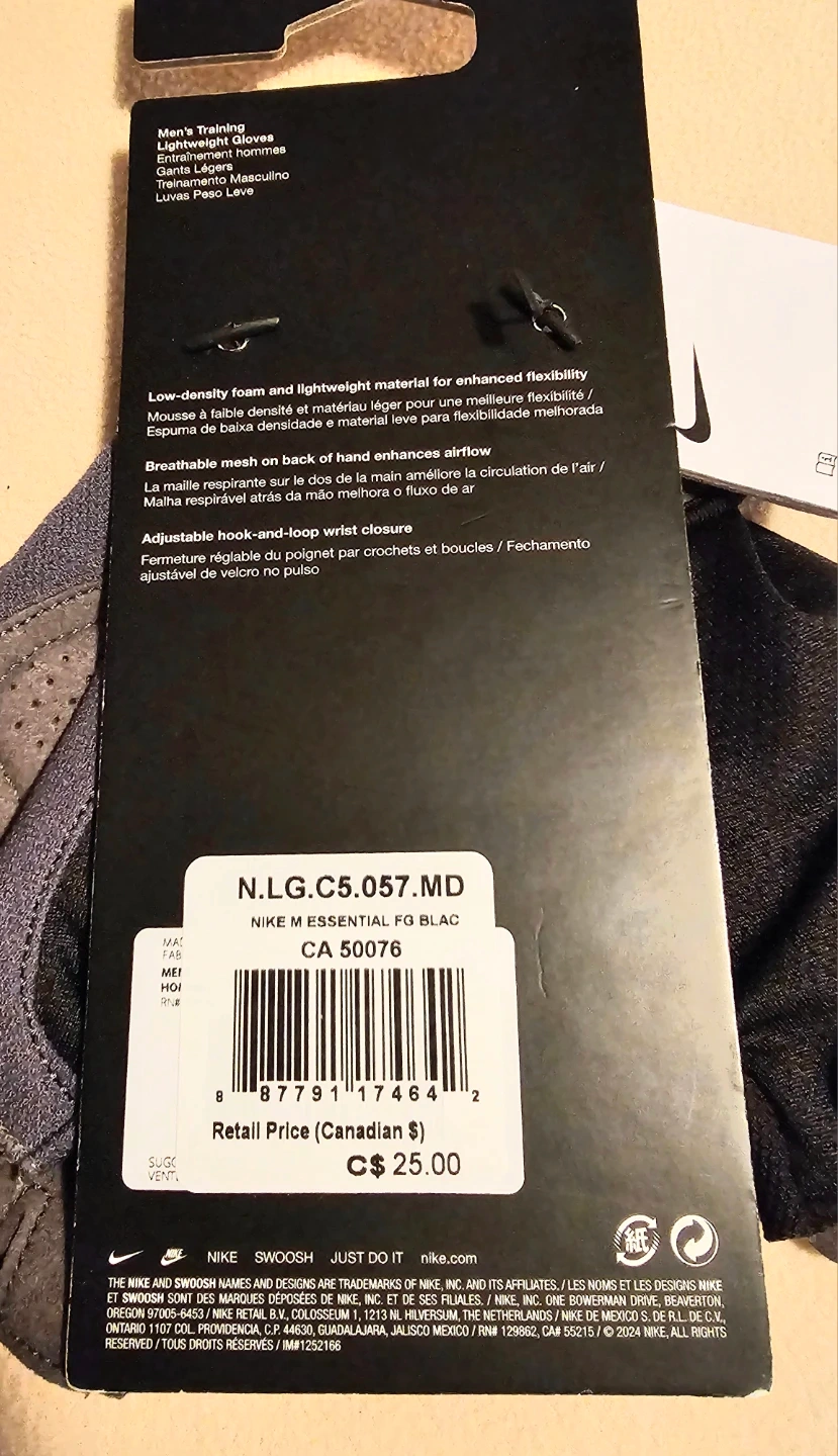 New Nike Essential Lightweight Gloves Size Medium. Perfect for men's training. Feature low-density foam and lightweight material for enhanced flexibility, along with breathable mesh to enhance airflow. Adjustable hook-and-loop wrist closure ensures a secure fit. $10