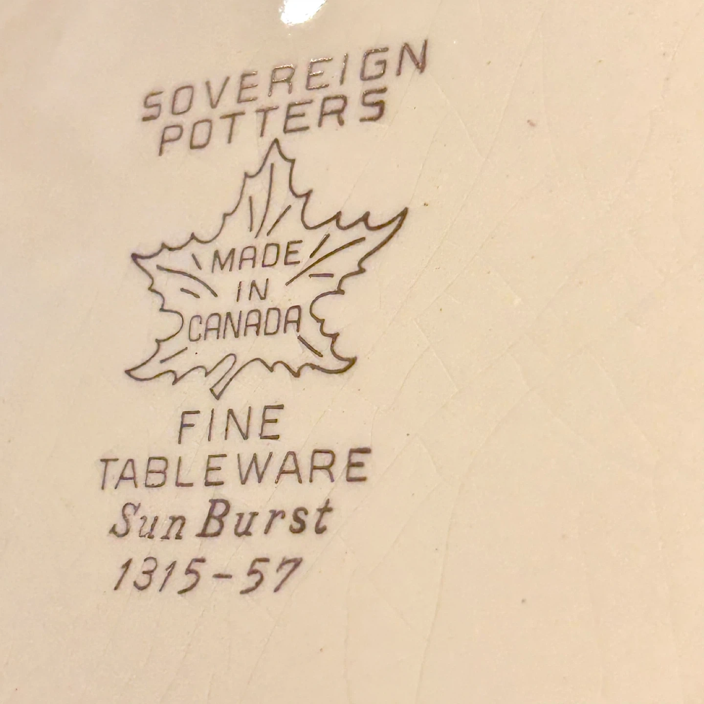 SOVEREIGN POTTERS – MADE IN CANADA – FINE TABLEWARE – Sun Burst – 1315-57 (maple leaf emblem).