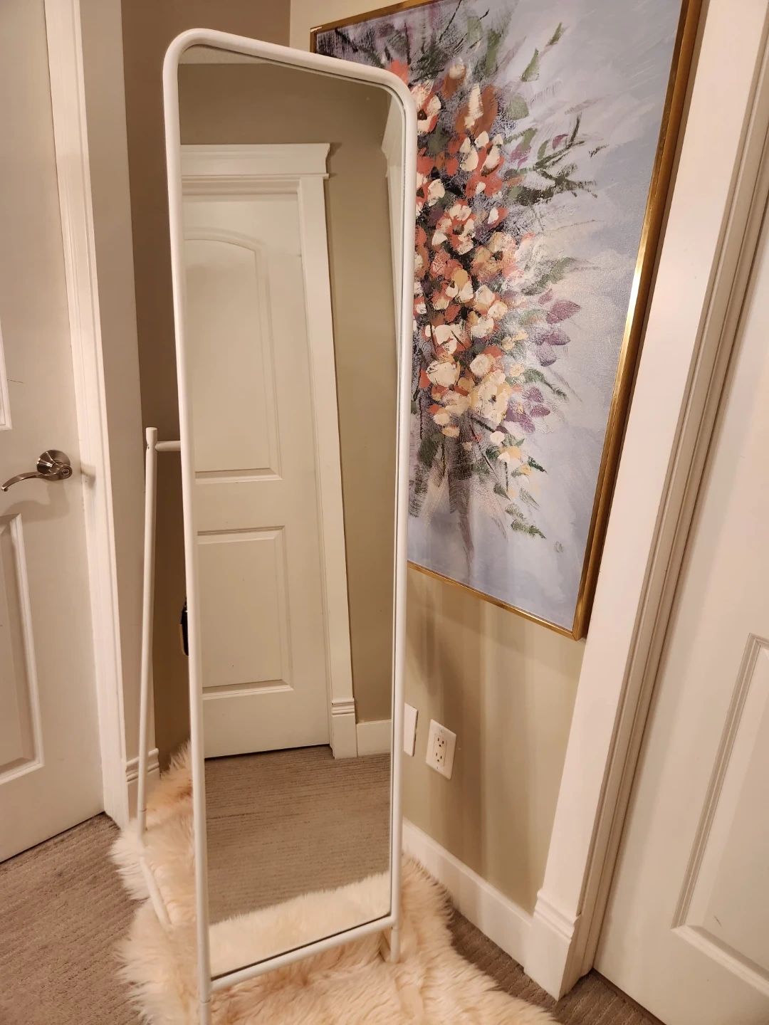 Selling a full-length standing mirror. It's in great condition and would look great in any room! The mirror is supported by a white frame. Mirror surface is 15x60 inches, back frame measures