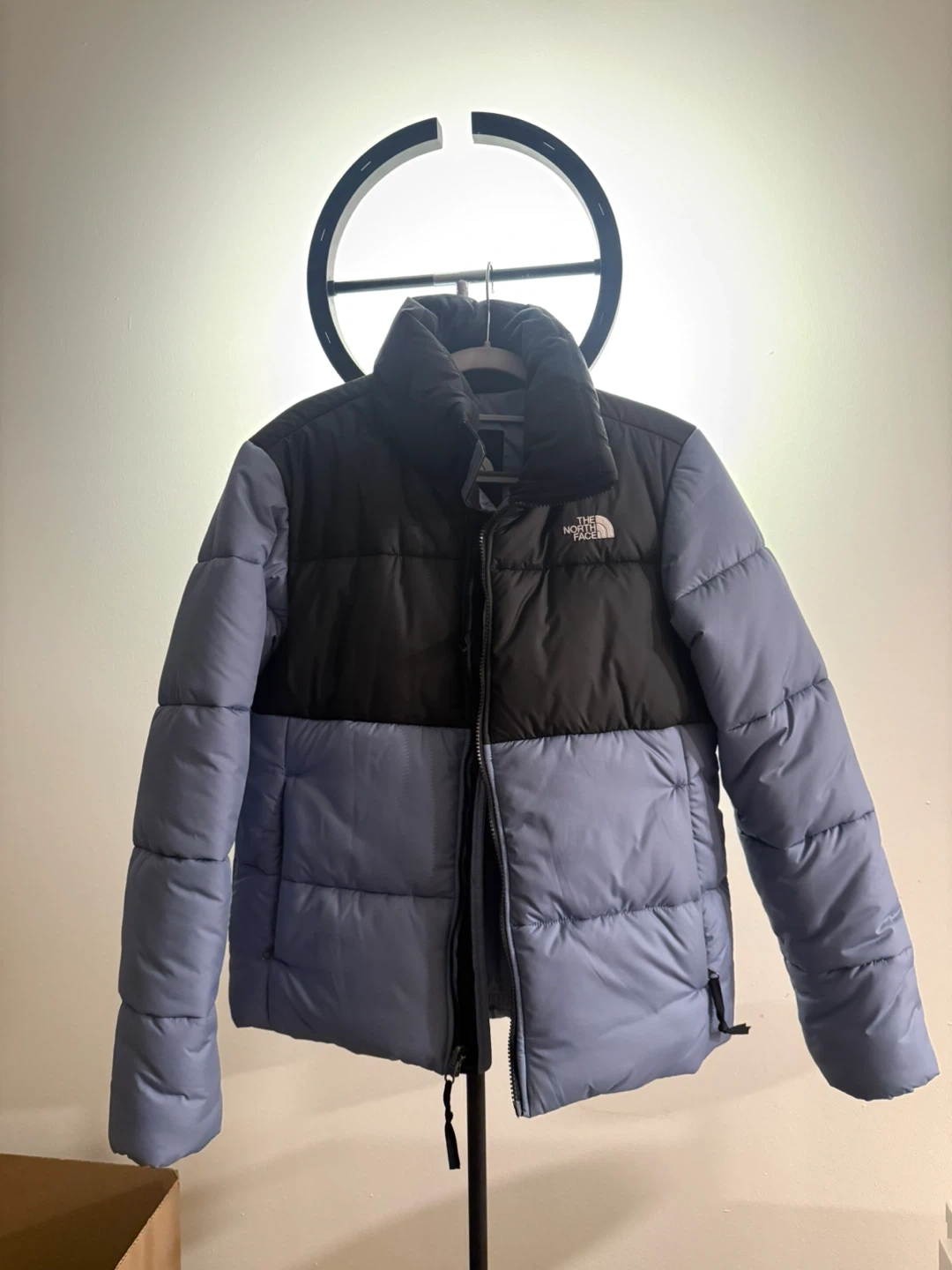Selling a The North Face puffer jacket in women's size medium. It's a stylish color block design with black on top and a light blue on the bottom. Perfect for staying warm and looking good!