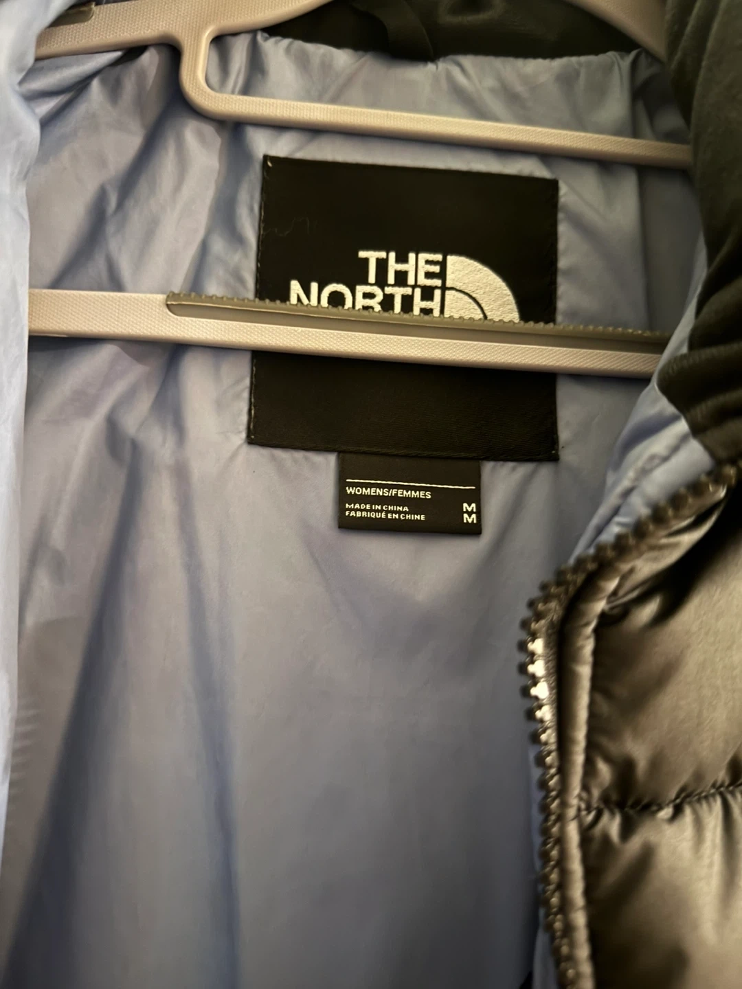 Selling a The North Face puffer jacket in women's size medium. It's a stylish color block design with black on top and a light blue on the bottom. Perfect for staying warm and looking good!