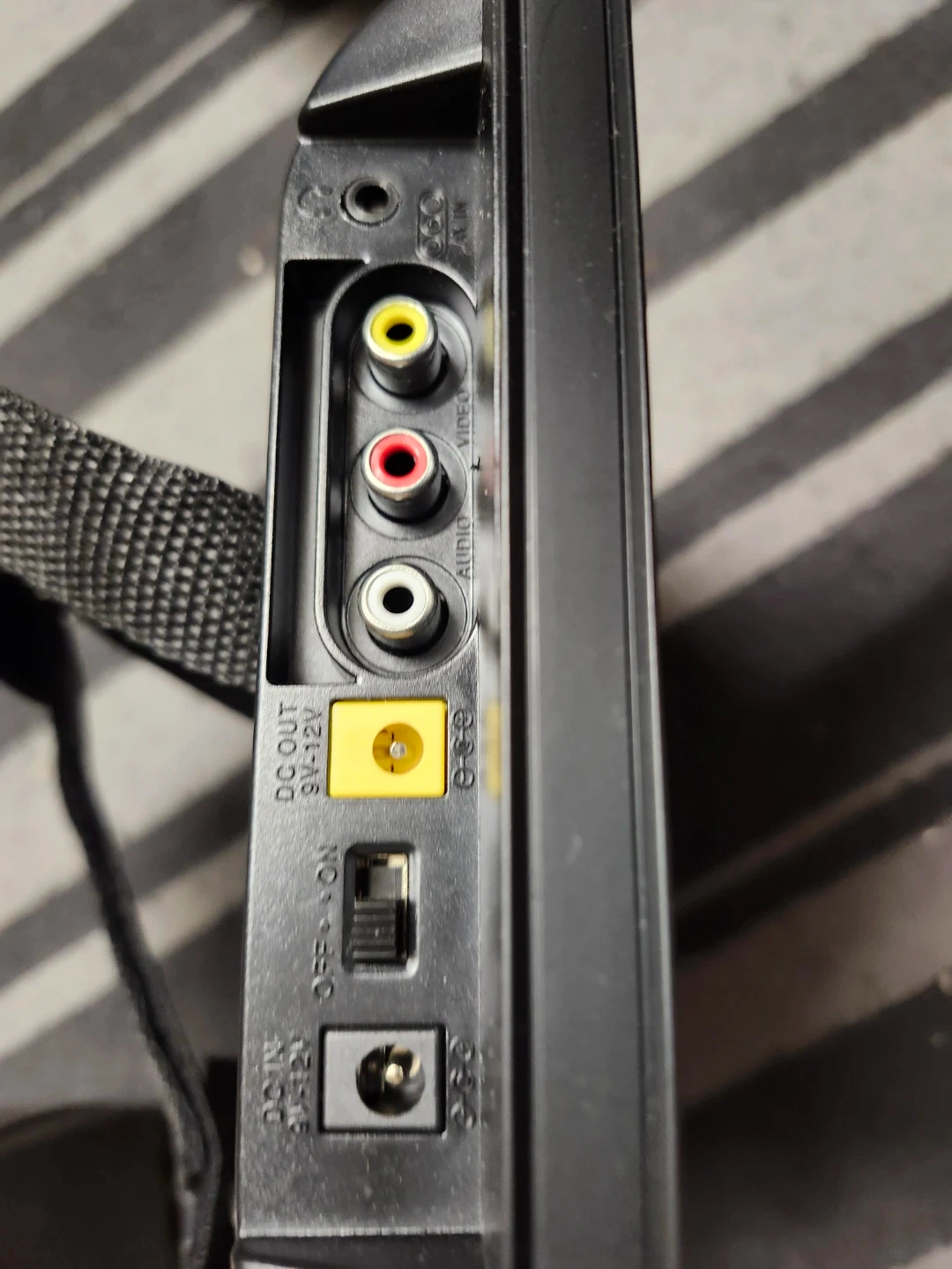 A/V input. You can connext portable DVD/BluRay player. comes with headrest strap.